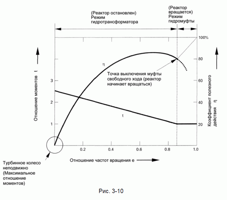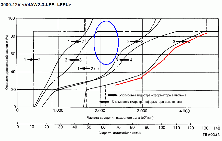 Но вообще-то опять же, если посмотреть эту же диаграмку режимов АКПП, то это примерно будет зона, которую я очертил синим овалом. И тогда вроде как получается, что КПП при этих 2500 работает на 2-й передаче, а ГТ не заблокирован, поэтому принимает всё на себя.