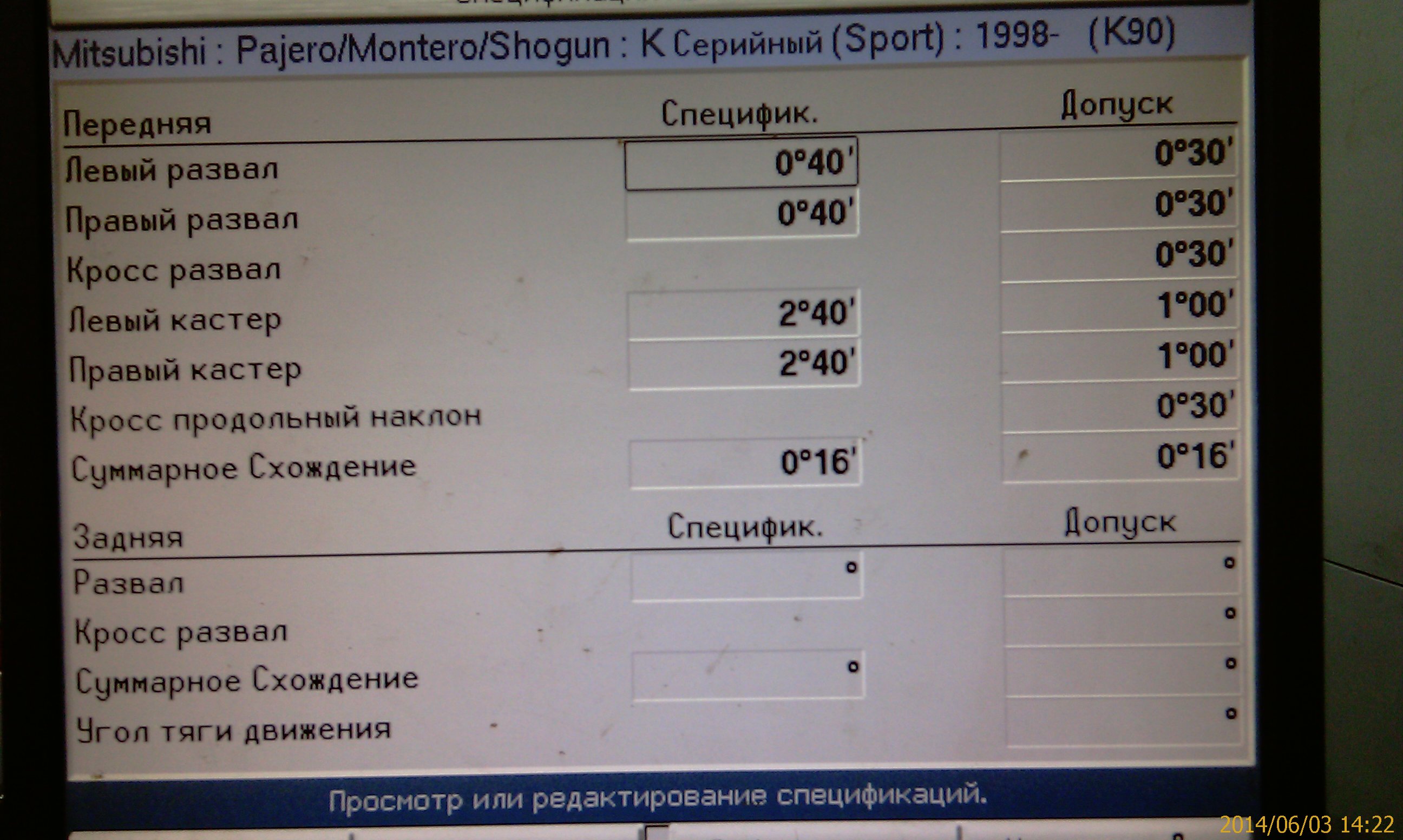 http://pajero4x4.ru/bbs/phpBB2/viewtopi ... 2#p1382833salavaba писал(а):Повторю свой вопрос, поиском не сумел найтинеужели с тех пор ничего не поменялосьsalavaba писал(а): Подскажите, плиз, где найти данные по регулировке развала-схождения на наше авто, а то на предыдущем ТО официалы собрались проводить регулировку сначала по данным для L-200, потом по карте Спорта 1998 для авто аж прошлого века.[: