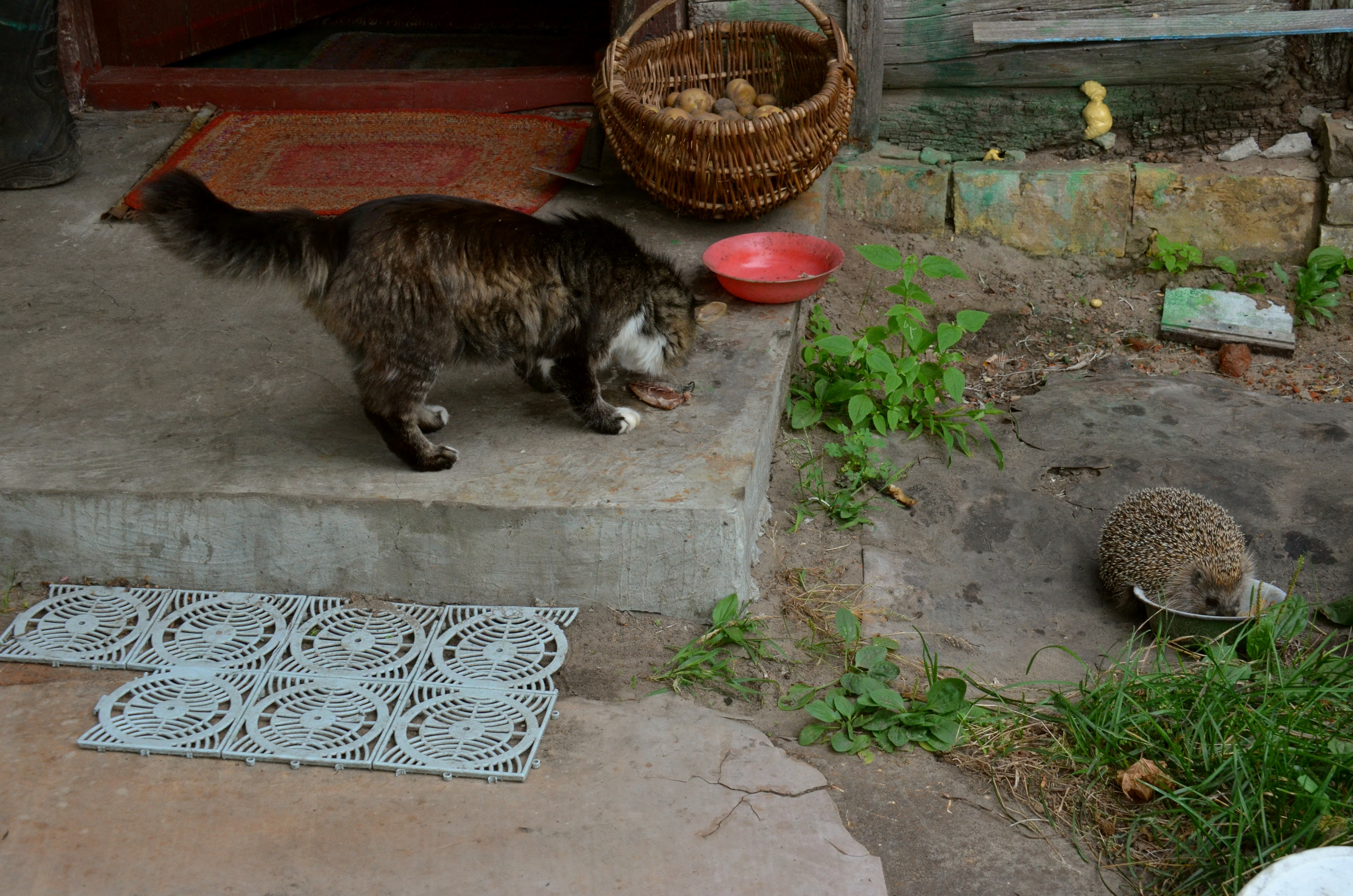 Они видать на пару бухали. Потому как трезвый кот, не может не слышать, как из его миски, да ещё такой, колючий увалень, жрачку тырит. Колючки и когти, должны неприменно скрежетать по краю миски...