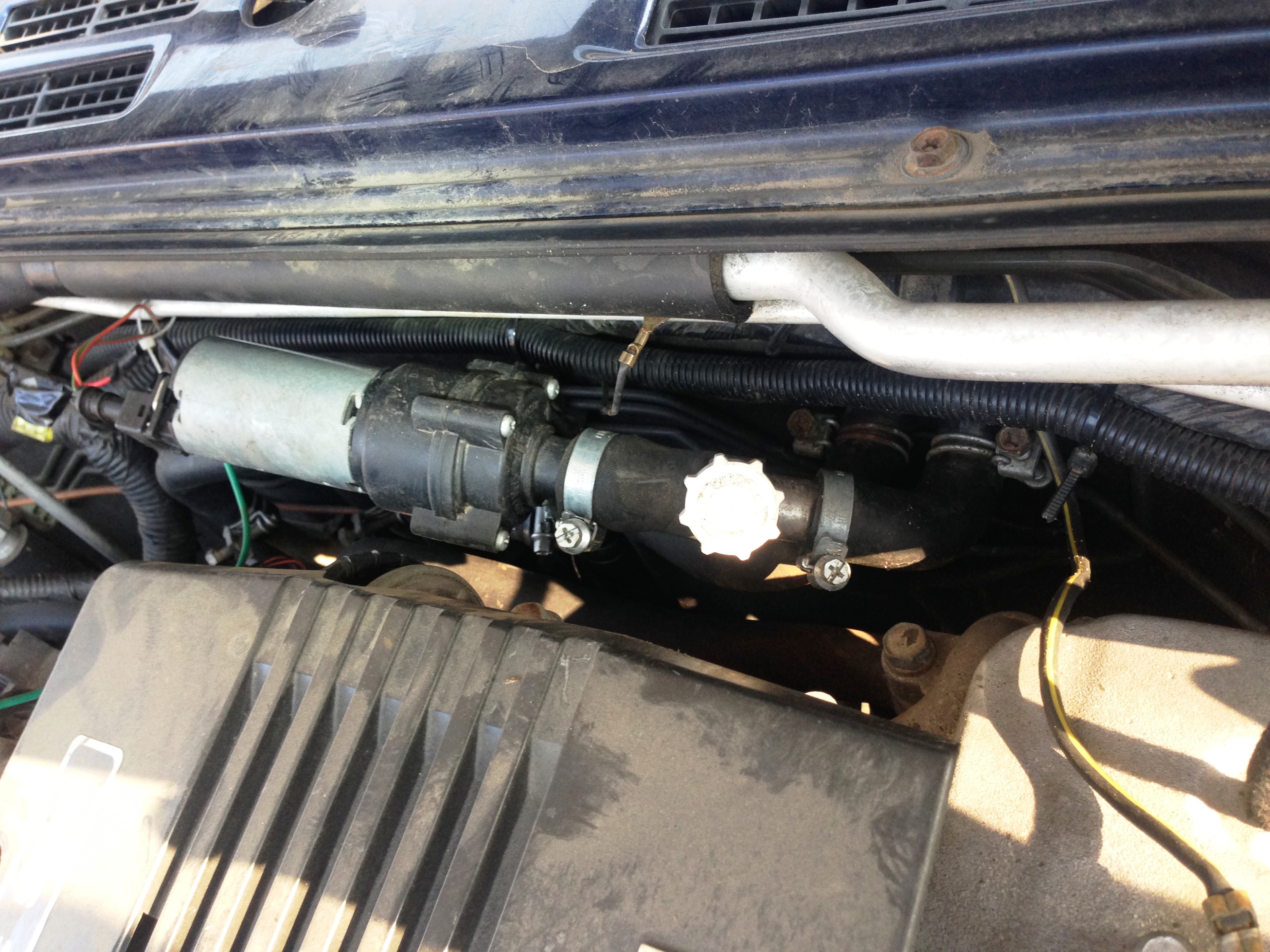, но лень природная все-равно не давала добро на разбор печки и упершись я пошел следующим путем : вразрез обратки печки установил электронасос Bosch (1560руб в existe) от Мерса, с небольшим геморроем с патрубками - тройник (пластмассовый) с блока на подачу печки и на заднюю печку рассыпался в руках, помог тройник от Газели в ближайшем магазе стальной за 45 руб, тоже с небольшим колхозом по диаметрам патрубков.Но и это тоже не дало желаемого результата, воздух как был еле теплым, так и остался. Решил поменять ОЖ с промывкой "Hi Gear 7 минутная"(тут в теме где-то описывали ее) и тут началось: грязь , точнее жижа ржавая с осадком тоже ржавым бурого цвета. Промывку заливал через обратку печки пока жидкость не выливалась через горловину радиатора основного, предварительно снял термостат и закрутил крышку обратно, чтобы промывался весь двигатель, потом закрывал кран сливной и крышку радиатора и компрессором( ну очень аккуратно) в тот же патрубок обратки печки продувал жидкость и так 17штук 5литровых бутылок воды, т.е. 8 раз пока с другого патрубка не пошла чистая вода и с патрубков и со сливного крана радиатора. Первые 2-3 раза прогонял промывку заведенным двигателем минут по 8-10. Результат: не могу сказать, что Африка (там не был
