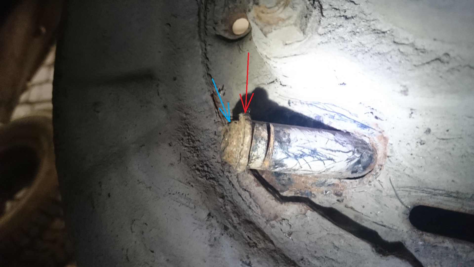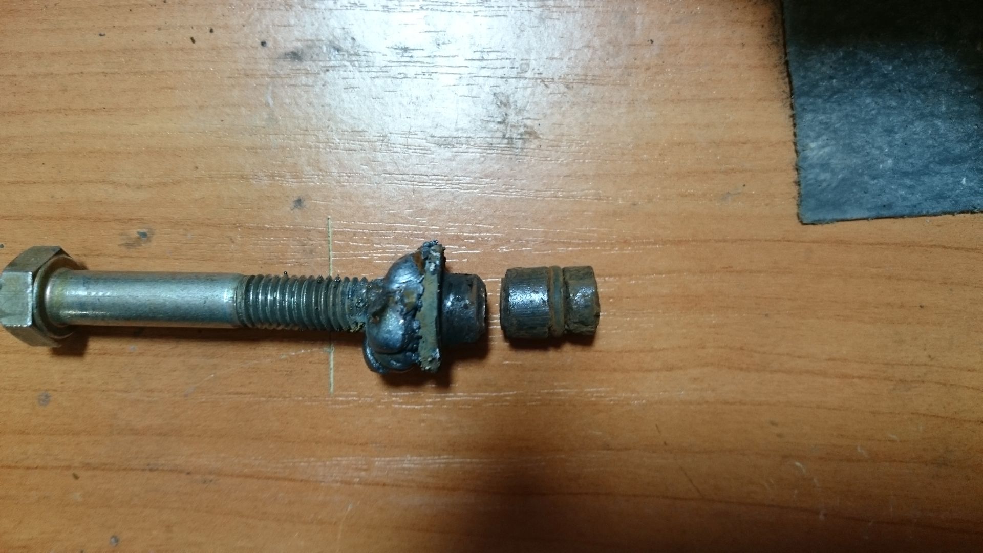 Выколотил огрызок. Приварил болт, тем самым прогрев железо. Попробовал провернуть, но отломилась только часть, по насечке для фиксатора. Потом выбил остаток с обратной стороны, там удобнее. Еще вчера на сутки заливал WD-шкой, но не помогло.