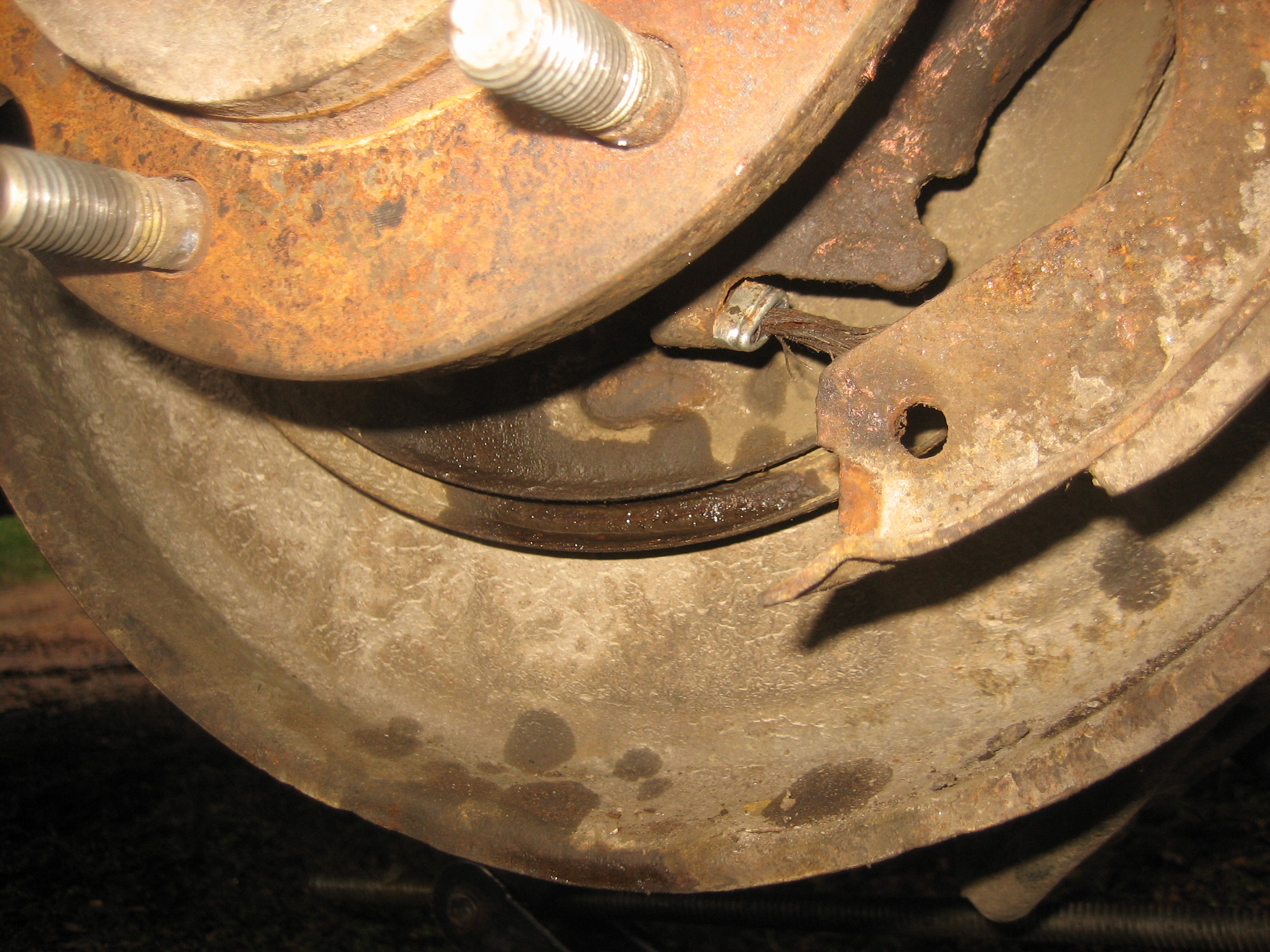 По тросу. Один из кронштейнов перепутан на 180 градусов, который резиновый. Недолго думая, просто разрезал его, все равно будет держать. Еще немного подумав, разрезал оригинальный и поставил его, форма более точная и резина толще. Еще один железный кронштейн тоже чуть другой по форме, впрочем, встал и такой. Резинка на конце, который вставляется в тормозной щит, очень толстая, не смог вставить, переставил оригинальную. Остальное вроде нормально, ручник держит хорошо.