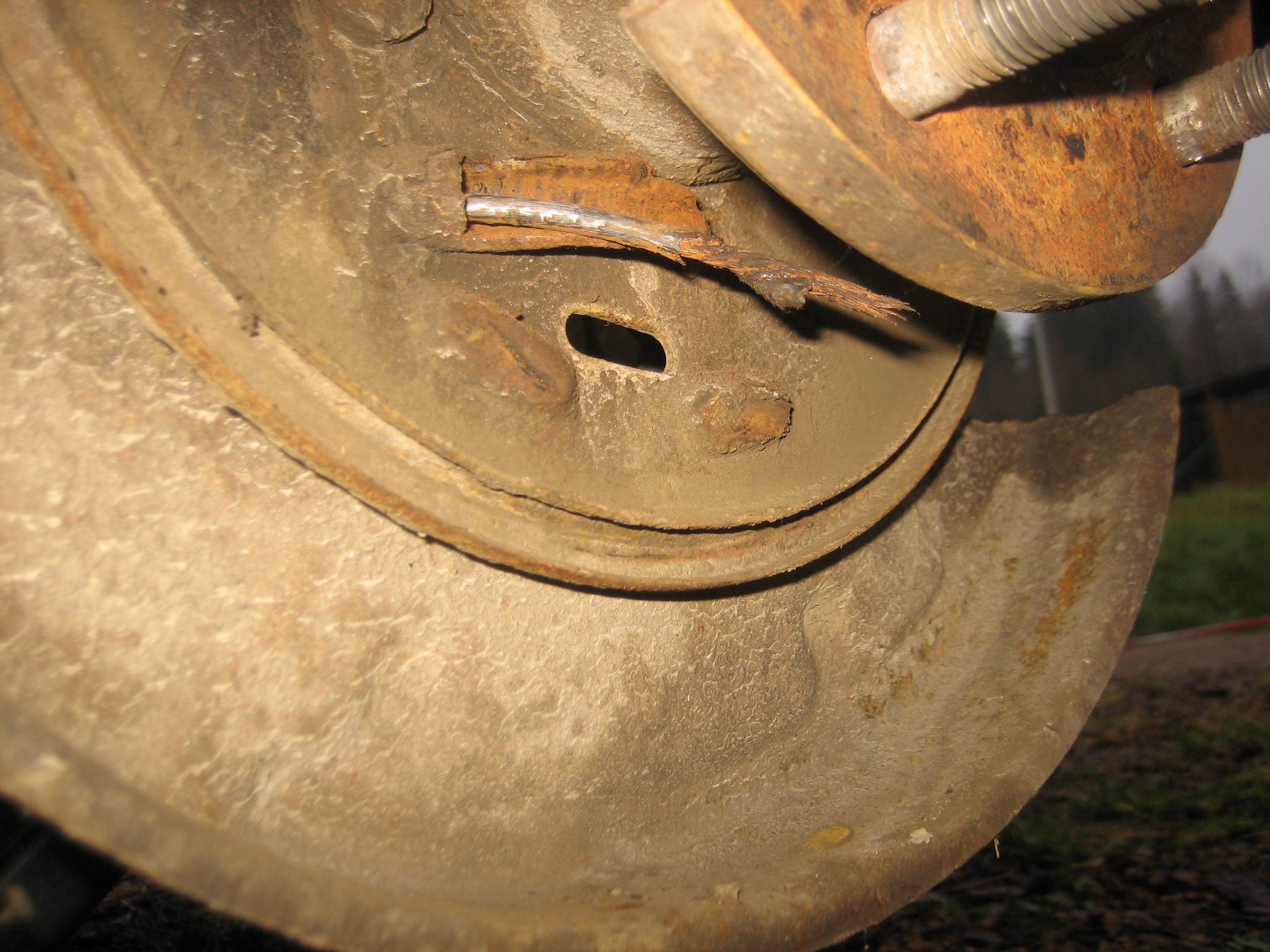 Отлично, тогда закажу, обещают доставку 1-2 дня. Еще вопрос. Не могу выбить остатки троса из тормозного щитка, и не могу понять, что выбивать. Похоже, утолщение (красная стрелка) тоже инородный предмет и его надо выбить? Или только синяя стрелка?
