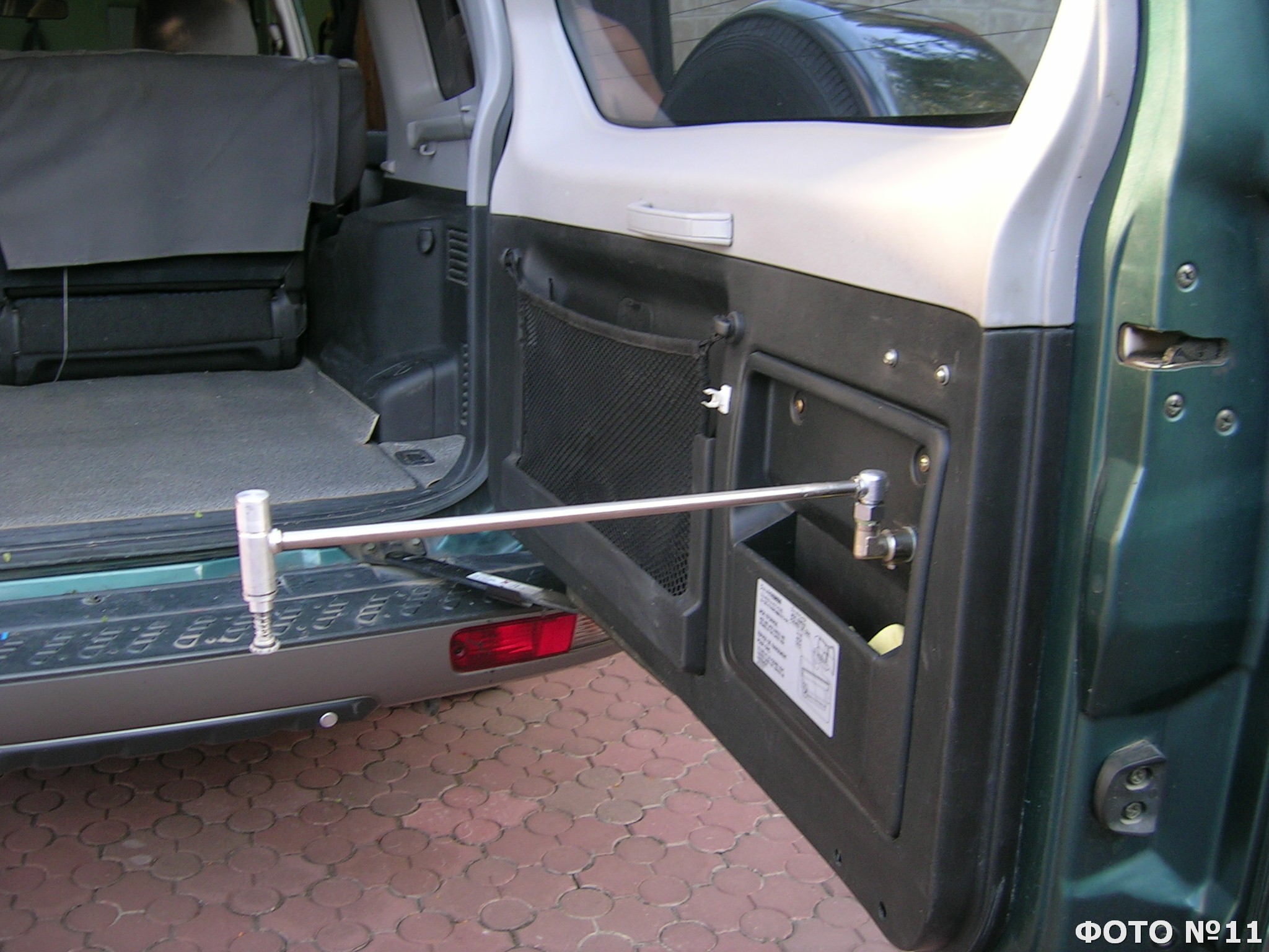 При снятой обивке двери,на ее стенке 1 закреплена пластина 3(фиг.1) с отверстием под штуцер10, для усиления жесткости стенки. Штуцер вставлен в отверстие изнутри и закреплен гайкой11.