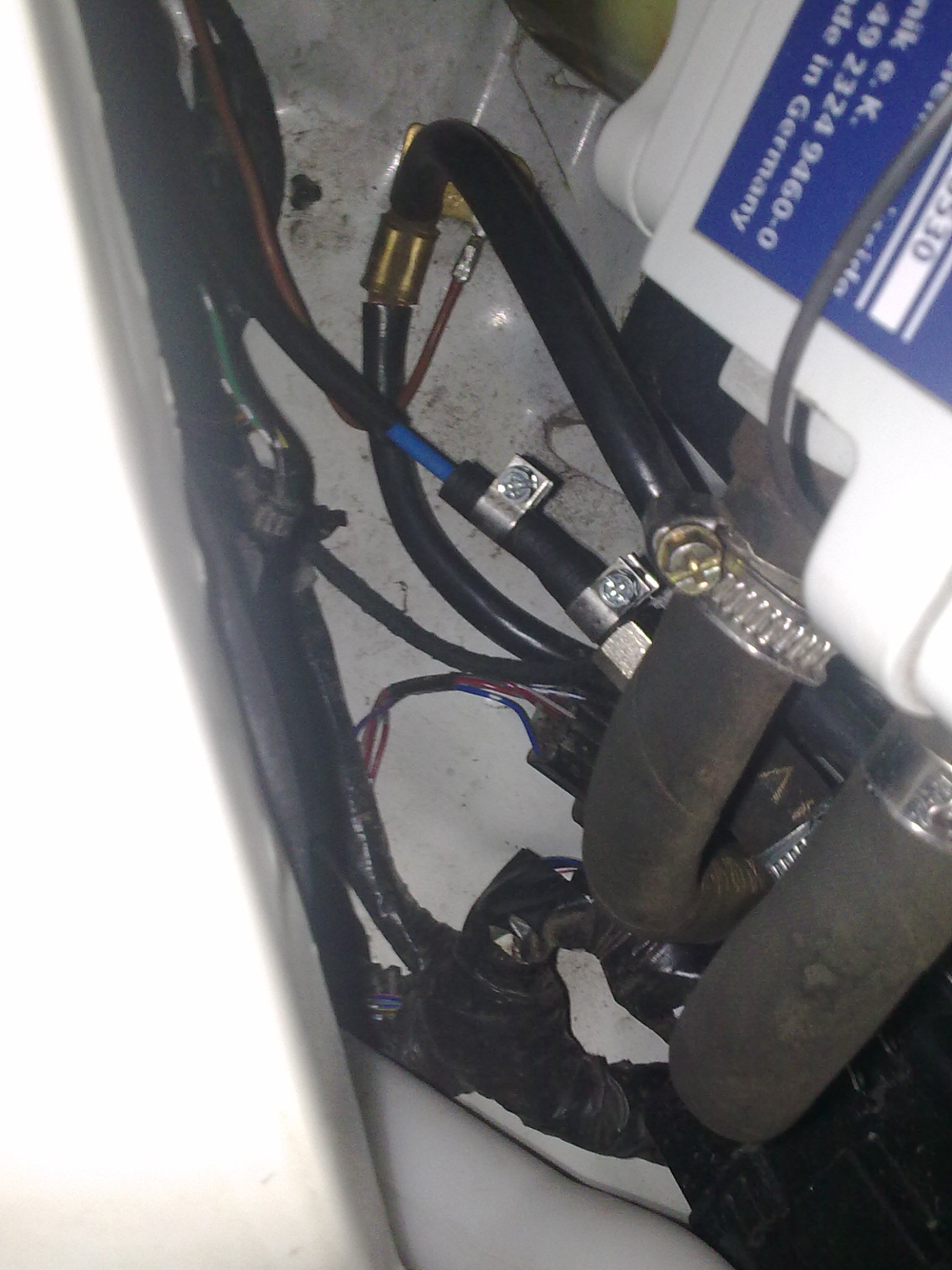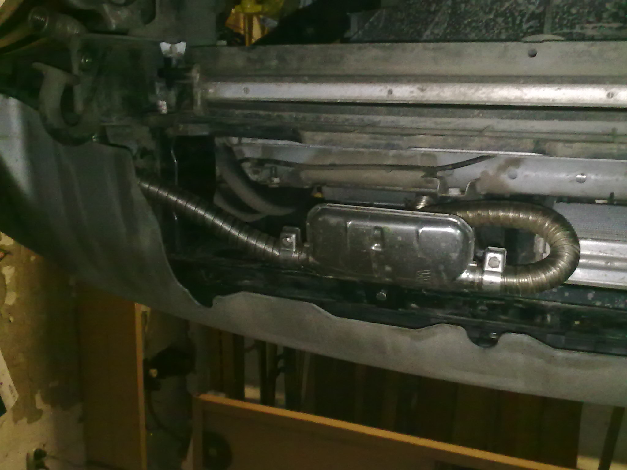 Возможных мест установки оказалось не так уж и много, особенно если минимизировать разборку машины. Подходящее место перед радиаторами на уровне бампера. Для поддержки снизу был сделан кронштейн, который упирается в паз подогревателя (пластина толщина 2мм, длинна 250 мм), крепится болтами на штатных креплениях кузова. Верхнее крепление было сделано из пластин которые входили в комплект подогревателя, от штатного крепления были отпилены 2 нижних уха, т.к. мешались, за верхние пластинами подогреватель жестко прижимается к нижней опоре. Подключение к системе охлаждения в месте Блок-Маслоохладитель.