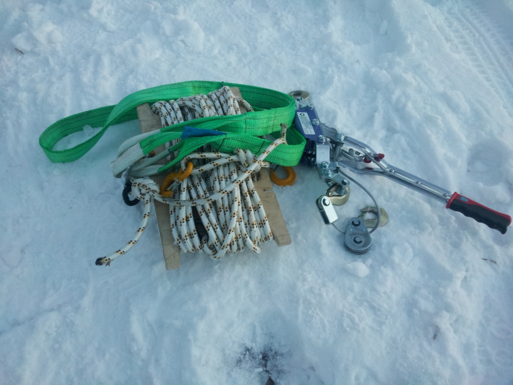 веревка полиамид -30м, набор стальных крюков-шаклов, приспособление для быстрой регулировки длины каната (позволяет вытащить из засады авто с одного якорения).