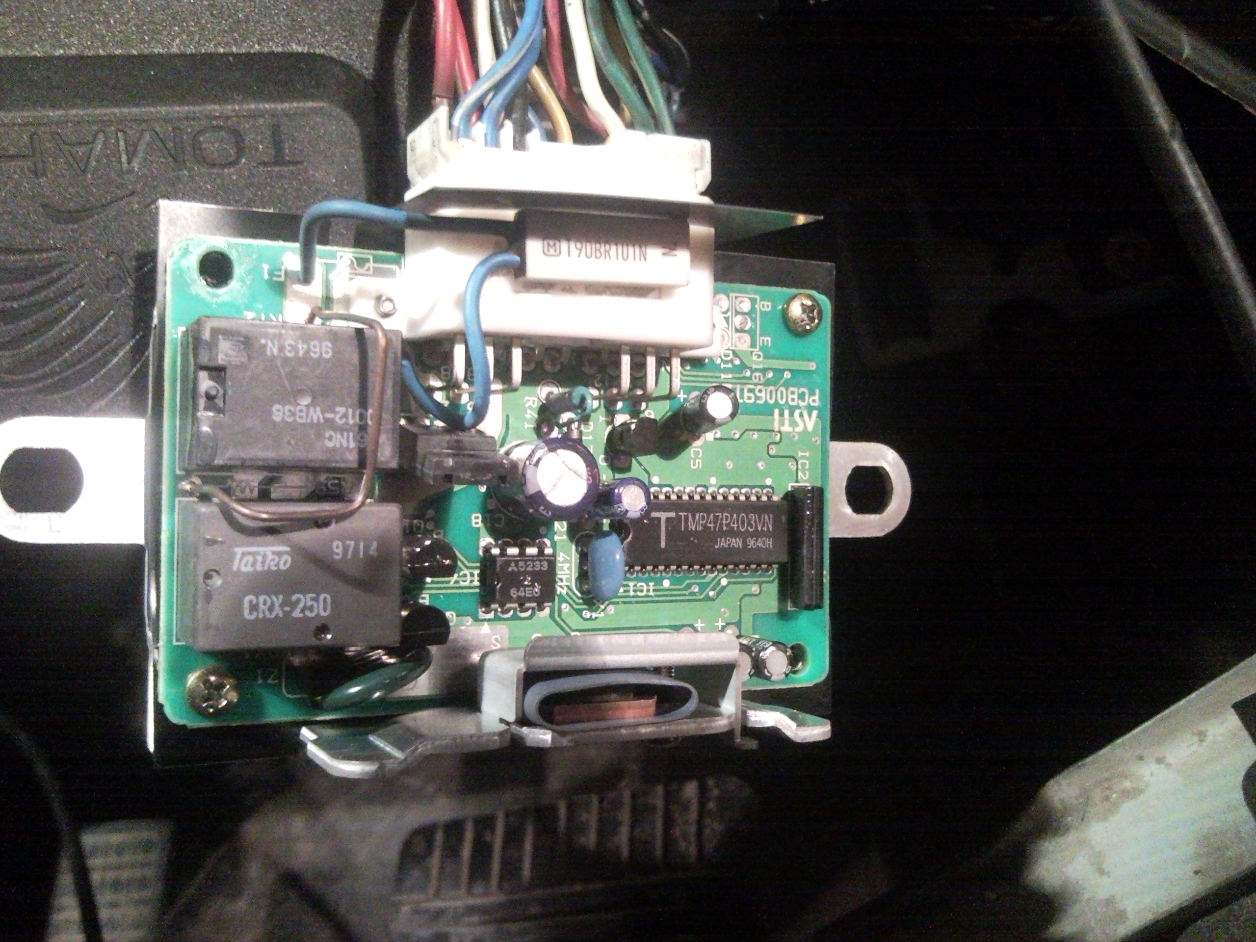 Схема твоя не менялась с 94 года. Были изменения, но не по теме головного света. Я конечно еще посмотрю, но вряд-ли. Блока твоего я в схеме не нашел, смотрел до 99-го года. Что странно ... но поищу еще. Теперь по блоку. Большая микросхема посередине - микроконтроллер тошибовский. Маленькая микросхема в центре - защита по питанию. На входе до 36В, на выходе 12В (упрощенно). Большой транзистор на теплоотводе напротив разъема - скорее всего мощный полевой транзистор (MOFSET). Схема сильно напоминает блок DRL (управление дневными ходовыми огнями). Как пример тут http://cxem.net/mc/mc57.php Разъем подпалило теплом от транзистора, скорее всего. Смотри его на предмет хитрых защелок. Скорее всего просто так не вытащишь. Пока все. Покопаю еще ...