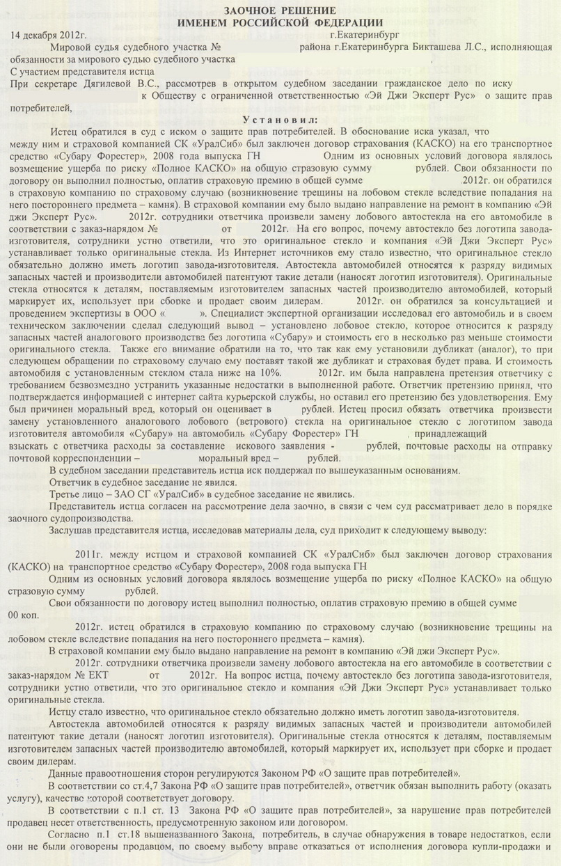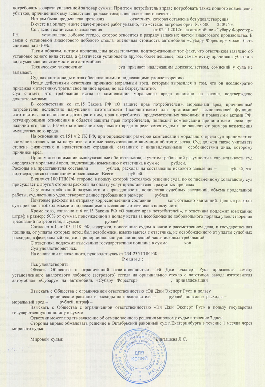 Долго пытался решить вопрос мирным путем, но все же пришлось обратиться в суд. До этого ознакомился с судебной практикой: "Помимо чисто материальной разницы в стоимости оригинала и дубликата владельца машины может ожидать и снятие с гарантии, и потеря стоимости при перепродаже автомобиля. По некоторым оценкам, утеря товарной стоимости может составить от 5% до 10%."
