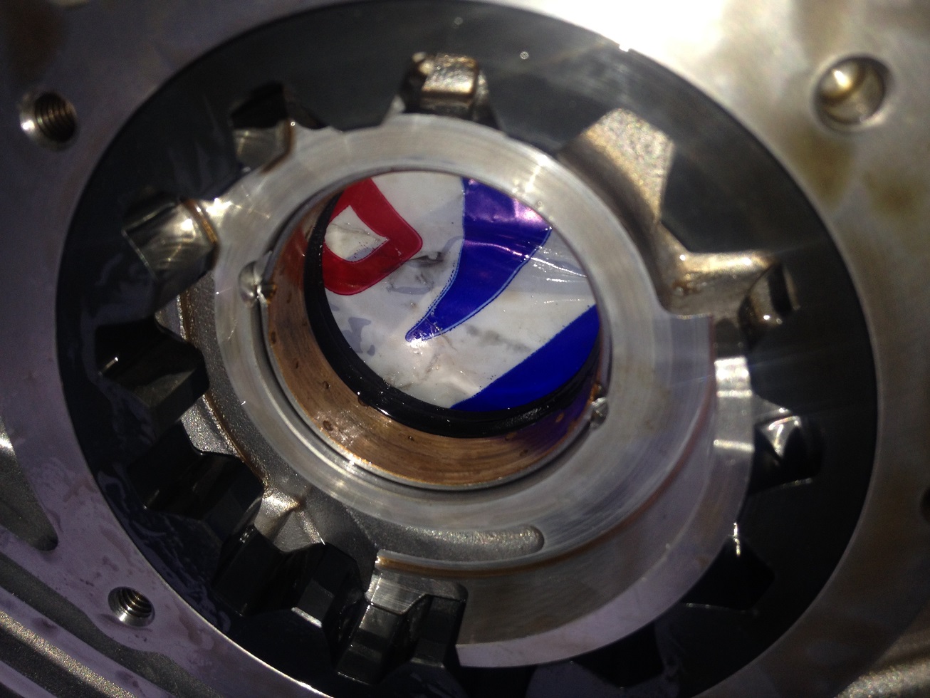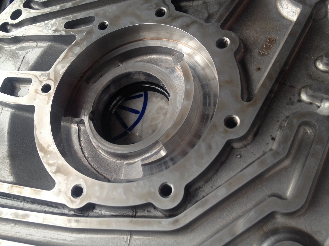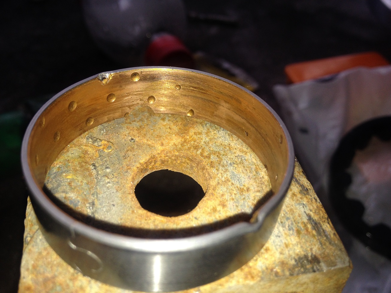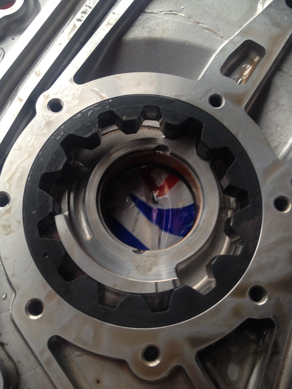 Эта втулка при перекосе перекрывает сливное отверсти-внутри самого насоса. Т.е это сливное отверстие находится буквально в миллиметре от этого кольца. Если кольцо повело как у меня, то оно перекрывает это отверстие и избытки давления начинают выдавливать сальник пеовичного вала (кажись), потому что маслу тупо некуда деться. Надо снять масляный насос и посмотреть кольцо на предмет малейших перекосов, затертостей неравномерных ( с одной стороны круга есть потертости, с другой нет). Если явно виден перекос или закрыто сливное отверстие-менять масляный насос на новый или б,у но с хорошим кольцом не без потертостей и перекосов.