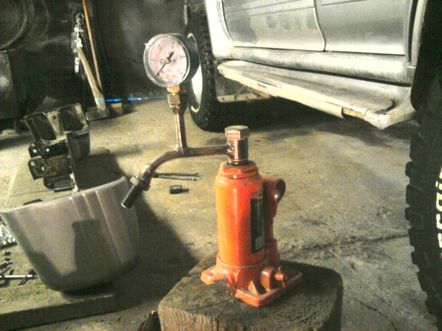 Для тех кто не хочет ехать в автосервис можно сделать вот такую штуковину для регулировки форсунок из китайского домкрата и манометра для кислородного редуктора.