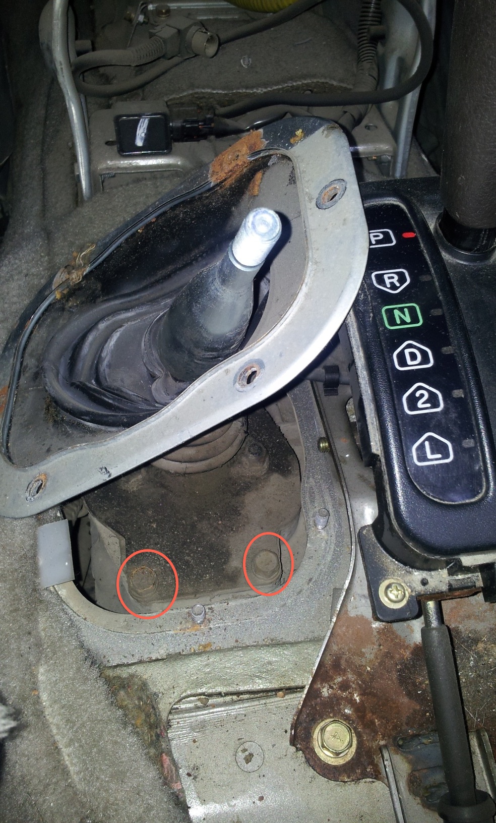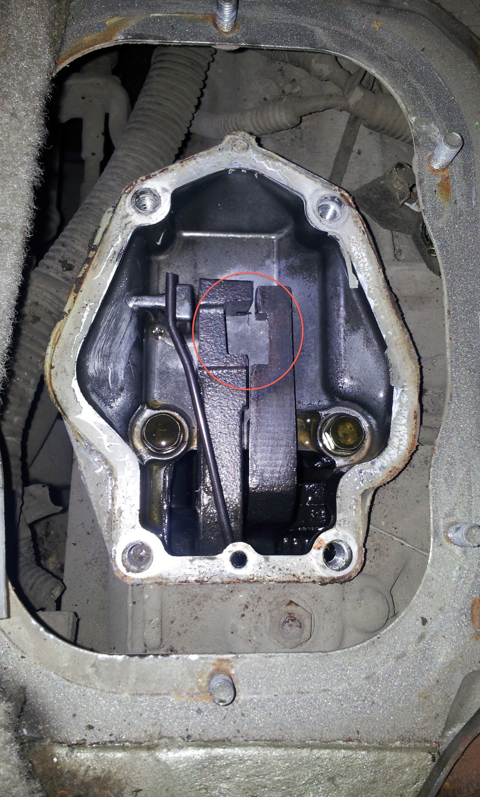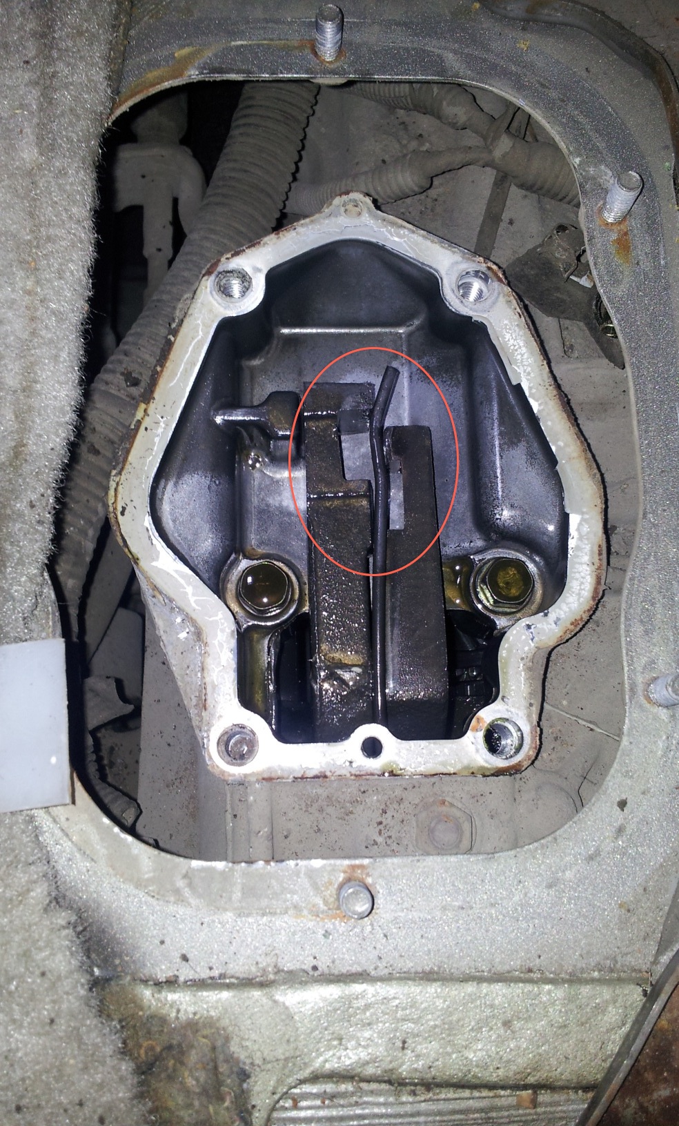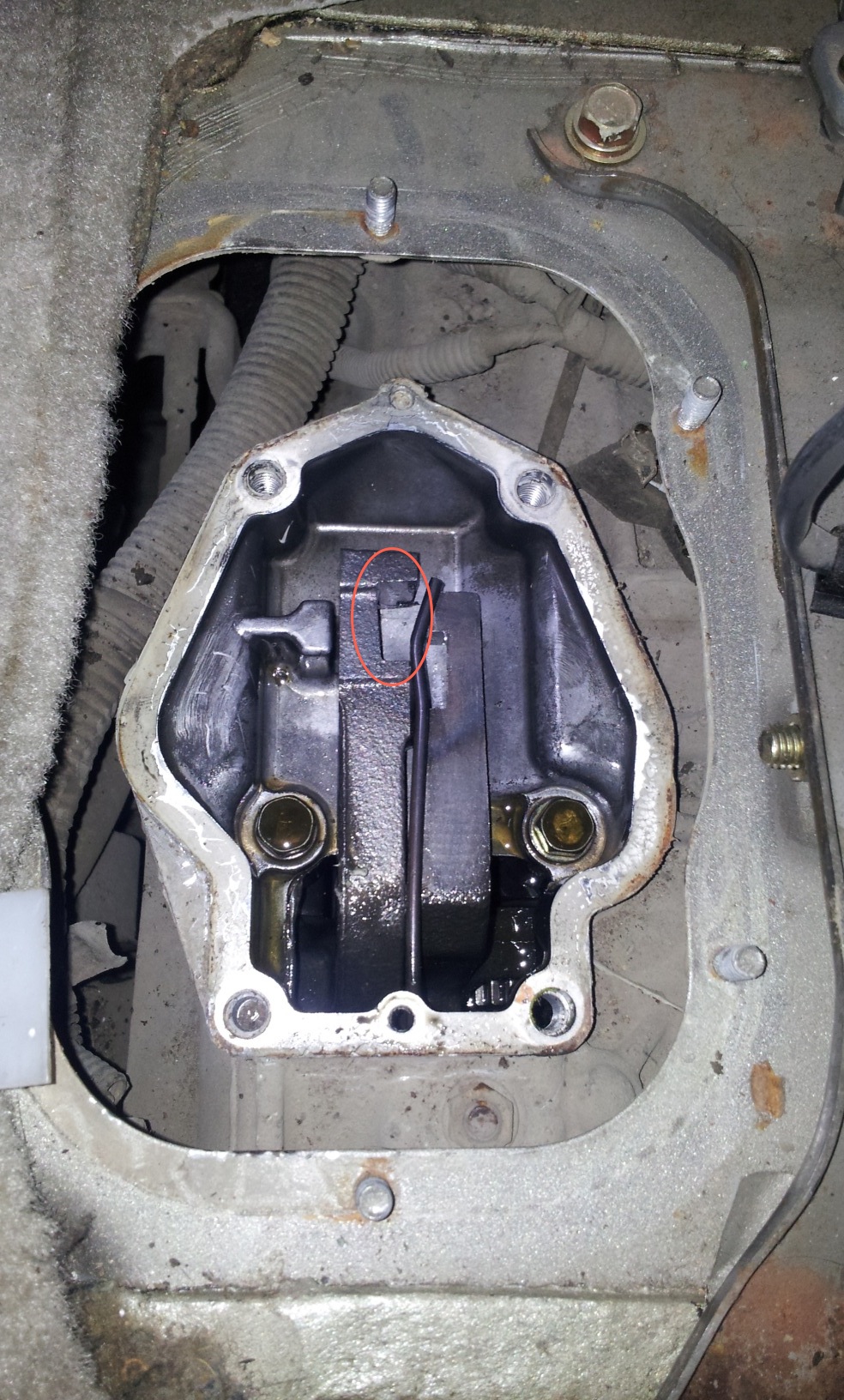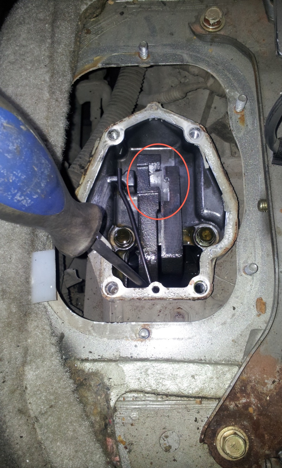 Всё правильно, рукоятку селектора трогать не нужно, собрал взад.Открутил оставшиеся саморезы (всего 8шт.) и снял консоль.Отвернул гайки пыльника (6 шт), поднял его вверх, но снимать не стал (насадка на рычаге не снялась). Потом отвернул четыре нужных болта, вытащил трубочку сопуна из пыльника и с горем пополам оторвал крышку от раздатки (герметик крепкий попался).Для этого пришлось загнуть и заточить конец старой отвёртки.Пружинка оказалась зажатой между тягами. Вытащил и отвёл влево пружину, а правую тягу передвинул до упора вперёд (то бишь выключил понижайку. Тоже самое проделал с левой тягой (отключил передок) Пружину поставил в исходное положение и закрыл крышку (рычаг при этом должен попасть в отмеченную овалом прорезь на левой тяге, пружина должна быть справа от рычага. Собирал на белый, Российский автогерметик. В шарнире никаких изъянов не обнаружил, люфта нет, пластмасски все целые. Покатался, повключал, поотключал - всё нормально. Вывод - передок подключать на ходу не прикладывая усилий, поджимая рычаг вправо и на возможно меньшей скорости, а лучше остановиться.