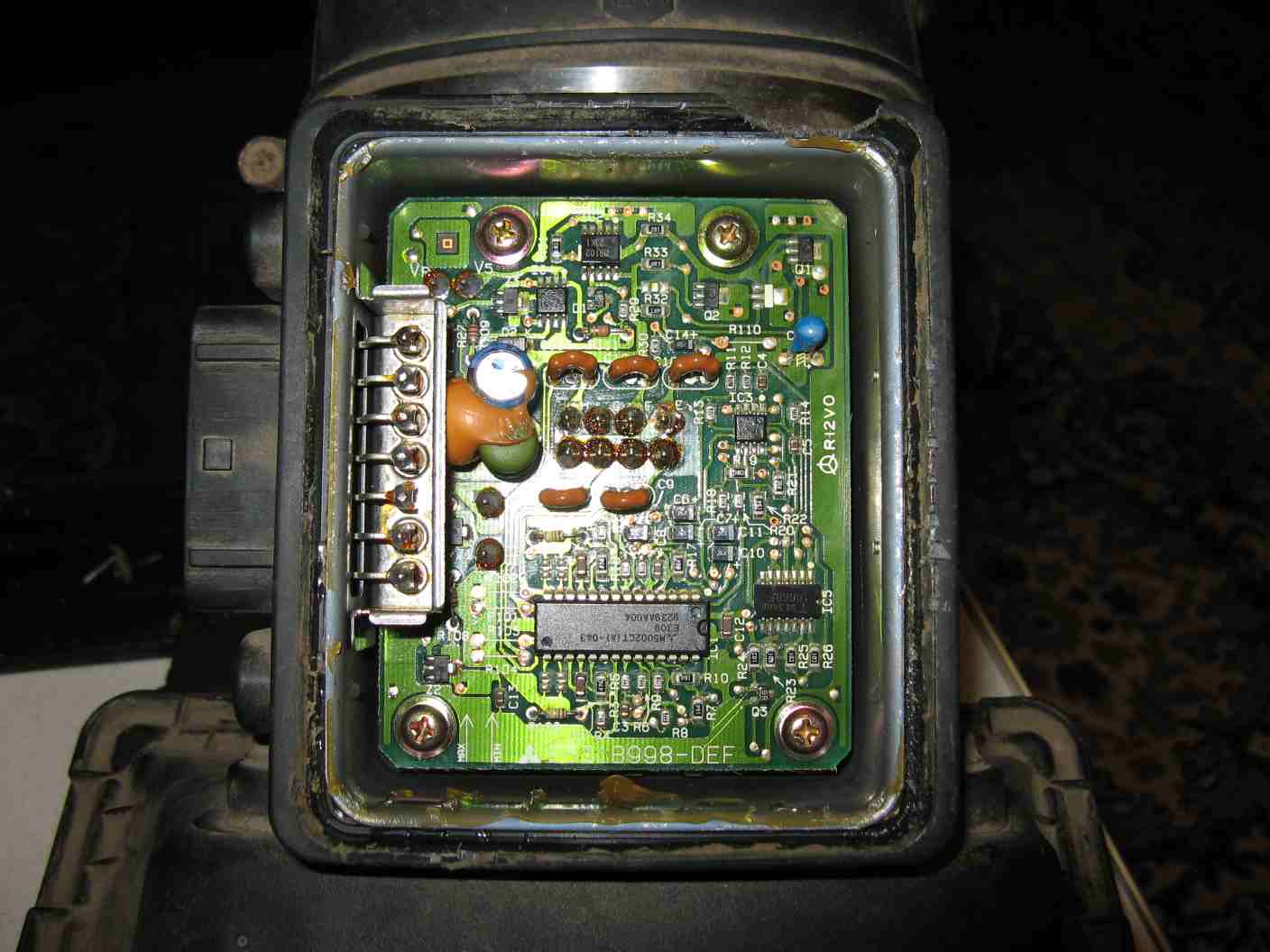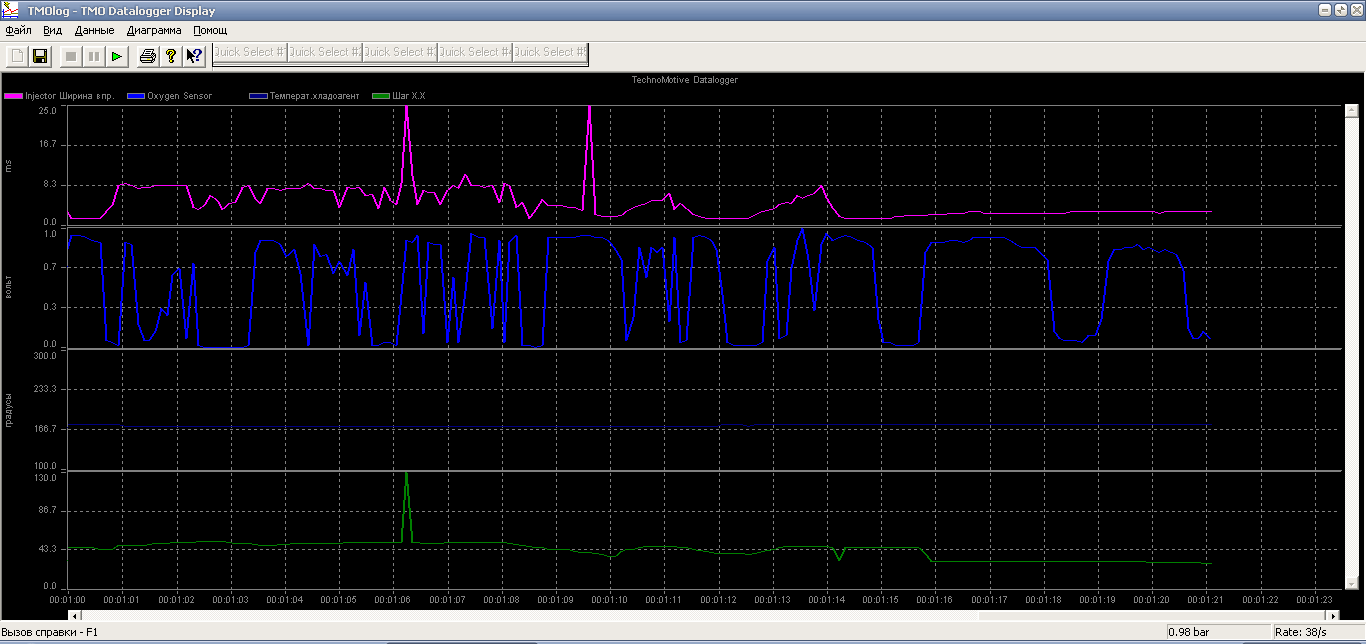 Движок решил мне мозг вынести. Дергается под нагрузкой, на разгоне. Газуя стоя на месте, не дергается. На первой передаче тоже не было, вот дальше, на 2-й, на 3-й, когда нагрузка посерьезнее, начинаются рывки и провалы. Дергается сильно, просто бьется в конвульсиях. Если разгоняться как пенсионер, то не дергается. Если отключить ДМРВ, то рывки исчезают. Надеюсь, что проблема именно в нем (закажу на разборке), но опыт подсказывает, что может быть и не так. Как-то раньше плавали холостые, отключение ДМРВ тоже помогало, но дело было не в нем. На диаграммах не обращайте внимание на выбросы, это шнур глючит, помеха какая-то прорывается. Видно что колбасит сигнал ДМРВ, но причина это или следствие - непонятно, поскольку подачу топлива на форсунки тоже колбасит. Проверил другую электронику: отключение ДПДЗ, РХХ, ЛЗ и замена ВВ катушки не влияет, рывки остаются на месте. На бензонасос не похоже, машина с отключенным ДМРВ рвет с места как надо, поэтому давление измерить поленился. Свечи и провода отпадают по той же причине. У кого-нибудь было такое? Поиском именно такого случая не нашел. ДМРВ разобрал в надежде, что высохли электролитические кондеры, но это не помогло. Правда, поменял только один, второй не похож на те, которые сохнут, да и маркировку я, честно говоря, не понял. Разъем отпаивал зря, все равно плата не снимается без отпайки датчиков в середине платы, у меня не было отсоса для припоя, припаял новый кондер просто сверху.