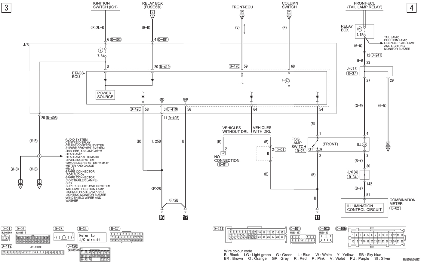 Само простое проверить релюху.А так сигнал на управление этой релюхи идет не прямо с выключателя,а с FRONT-ECU,и если релюха исправна надо проверять наличие этого самого сигнала.