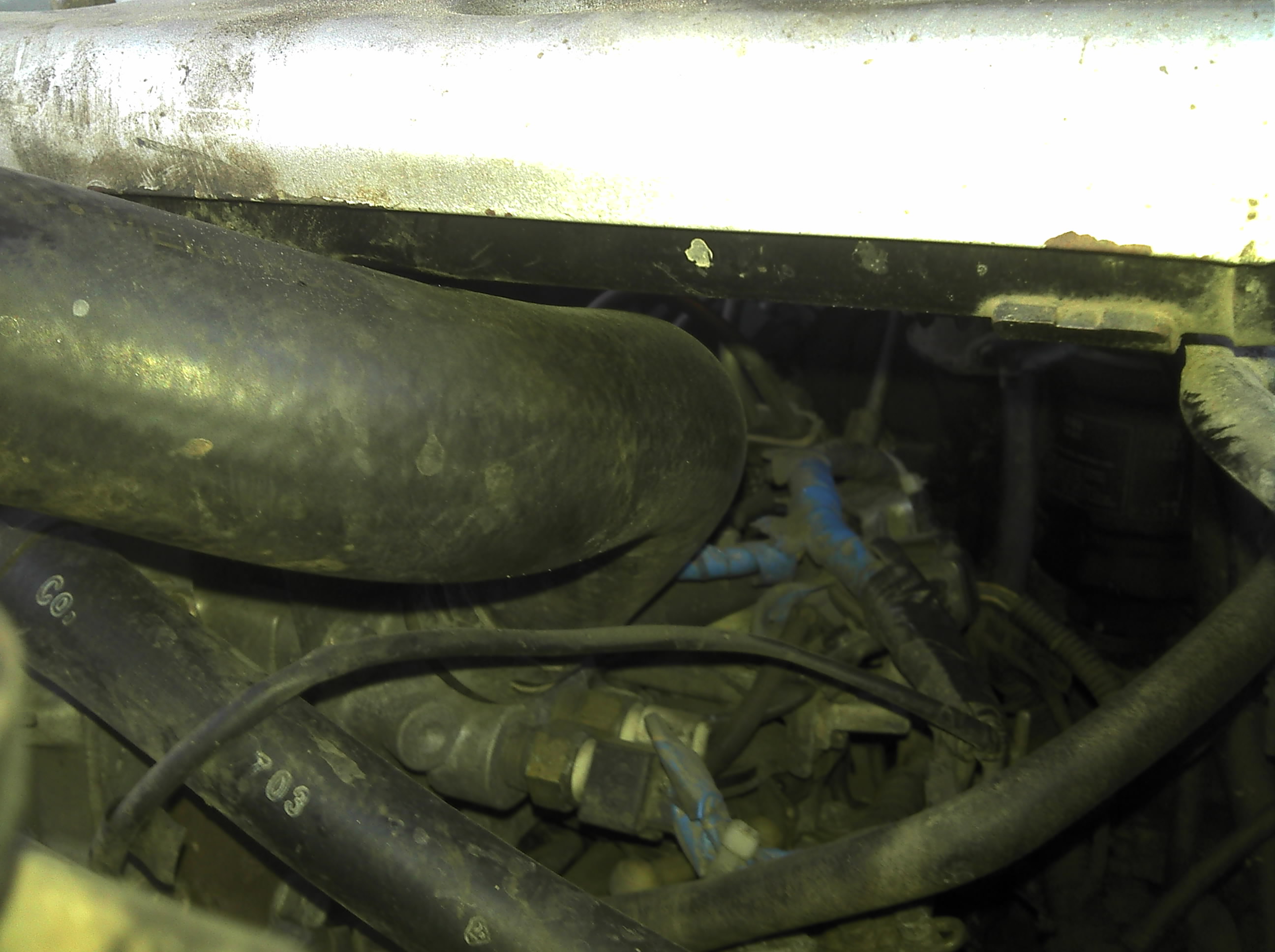 Тут обнаружил, что у меня верхний патрубок радиатора соприкасается с интеркулером. Видимо когда ставил движок на новые подушки он стал не много выше, но пока точно не понял почему так получилось. Временно подложил шайбы под крепление интеркулера (результат виден на фото).