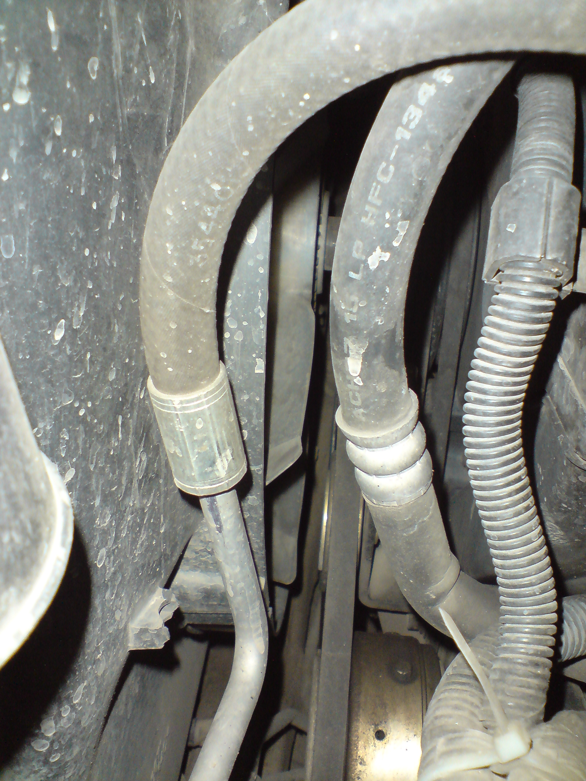 Проблемка нарисовалась. В прошлом году кондиционер работал без проблем (чинил радиатор, заправил фреоном). В этом холодит слабо. Начал искать. Нашел, что на шланге кондиционера, идущем от радиатора к компрессору (обратка, сторона низкого давления, как я понимаю) есть потеки масла, которое заправляют в кондиционер (стрелкой показал).