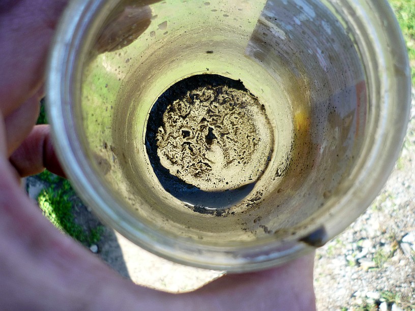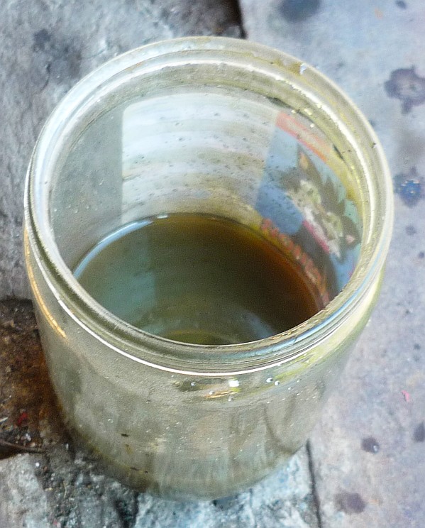 Занимался тут намедне движком, скидывал головы. Перед установкой их назад что-то дёрнуло меня ткнуть длинной отвёрткой в канал ОЖ возле 5-го цилиндра в неслившиеся остатки антифриза. Жало отвёртики воткнулось во что-то вязкое. Как оказалось в дальнейшем, это грязь, скопившаяся в непромываемых впадинах. Т.к. двигатель наклонён, то скапливается она больше всего возле дальних цилиндров. Начал шурудить там отвёрткой и промывать водой с помощью шприца с насаженной трубкой. Мама дорогая, чего там только нет! И шмотки герметиков разных цветов, и песок, и что-то типа речного ила. Закачивал в каждую половину блока по 5-6 20-и кубовых шприцов воды, потом откачивал. И так по 4 раза. Вот такая вода была после второй помывки (сразу не сообразил зафоткать, грязи естественно ещё больше было), на второй фотке осадок на дне банки. Я воду из лужи не заливал, но похоже до меня это делали