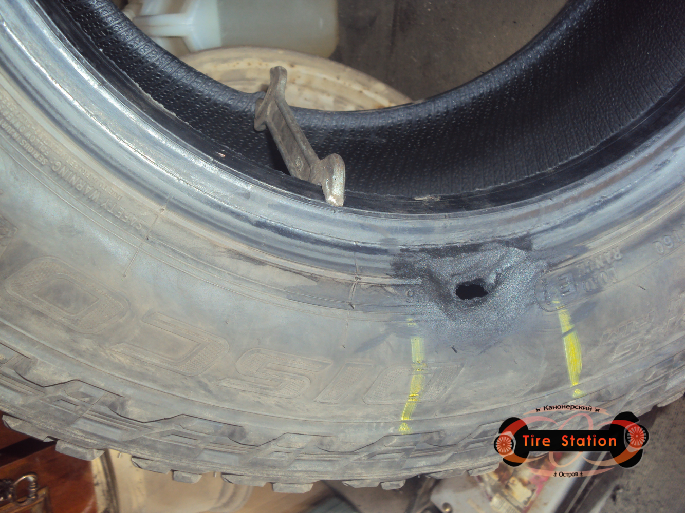 Особое внимание хочу уделить именно сложному ремонту боковых порезов и привести некоторые фотографии наших работ. Ведь "вставлять жгуты" и сезонно "переодевать" могут без исключения все. Для этого особо не надо учиться, большой опыт не требуется, да и дорогостоящее оборудование для ремонта можно не покупать, а ограничиться парой китайских станков... В нашей мастерской все по-другому, например: мастер имеет огромный опыт (более 8 лет) в сфере ремонта не только легковых, но и грузовых шин (в них давление доходит до 9,5 атмосфер); материалы мы используем только Tip-Top (Германия), Tech (США), но, самое главное, что мы предоставляем гарантию на ремонт (каждый порез мастер осматривает индивидуально, и на основании этого принимается решение о гарантии. Бывают совсем безнадежные случаи, которые мы тоже можем сделать, но без гарантии, например, если у клиента редкий размер резины и необходимо время для поиска и приобретения новой покрышки.)