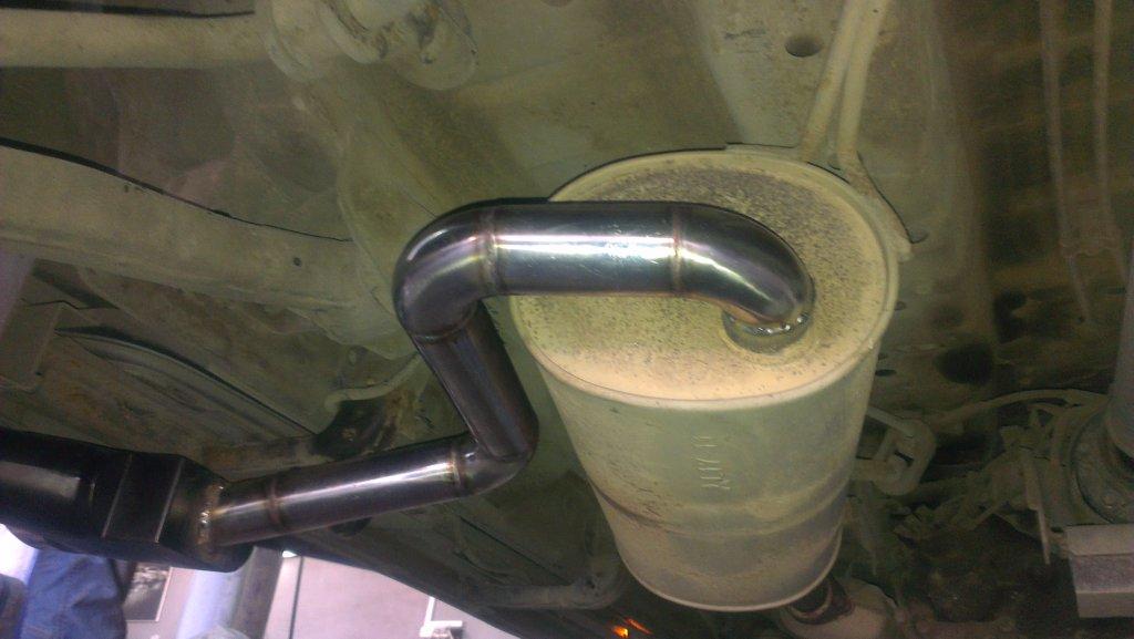 В общем пришла мысль отрезать этот кусок на изгибе над задним мостом, вварить фланец и к фланцу крепить новую конструкцию, а именно раздвоенную выхлопную, точнее две выхлопные.