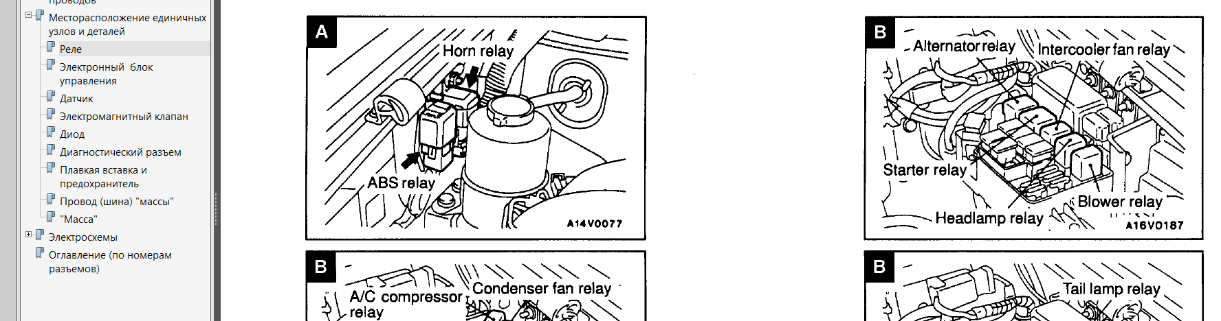Расположение отдельных элементов. Для того, чтобы понять где и что стоит есть специальный раздел "Местоположение отдельных узлов и деталей". Там много "вкусного". В частности показано где стоят реле, различные блоки управления, датчики, электромагнитные клапаны, диоды, диагностический разъем, плавкие вставки и предохранители, точки массы. Например для реле это выглядит так.