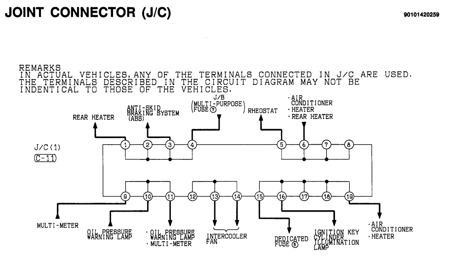 Это очень удобно для определения "что за разъем". На обозначении сначала идет обозначение разъема, затем в скобках количество контактов и цвет. Если цвет не указан - разъем белый. Обозначения цветов как в проводах. Например А-39 (2-B) Headlamp - разъем А-39, два контакта, цвет черный, головной свет.