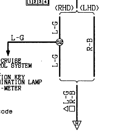 В схемах нужно обязательно обращать внимание на значки LH и RH. Это соответственно левый и правый руль. Обратите внимание, что вместо букв могут использоваться обозначения треугольник (Правый руль) и квадрат (Левый руль). На схемах такие знаки обычно стоят, если есть различия в номерах контактов или цветах проводов между право и леворульными моделями. Также обращайте внимание на обозначение типов двигателей Patrol - бензин, Diesel - дизель. Эти обозначения могут встречаться как в заголовке схемы, так и на самой схеме, показывая отличия этих модификаций.