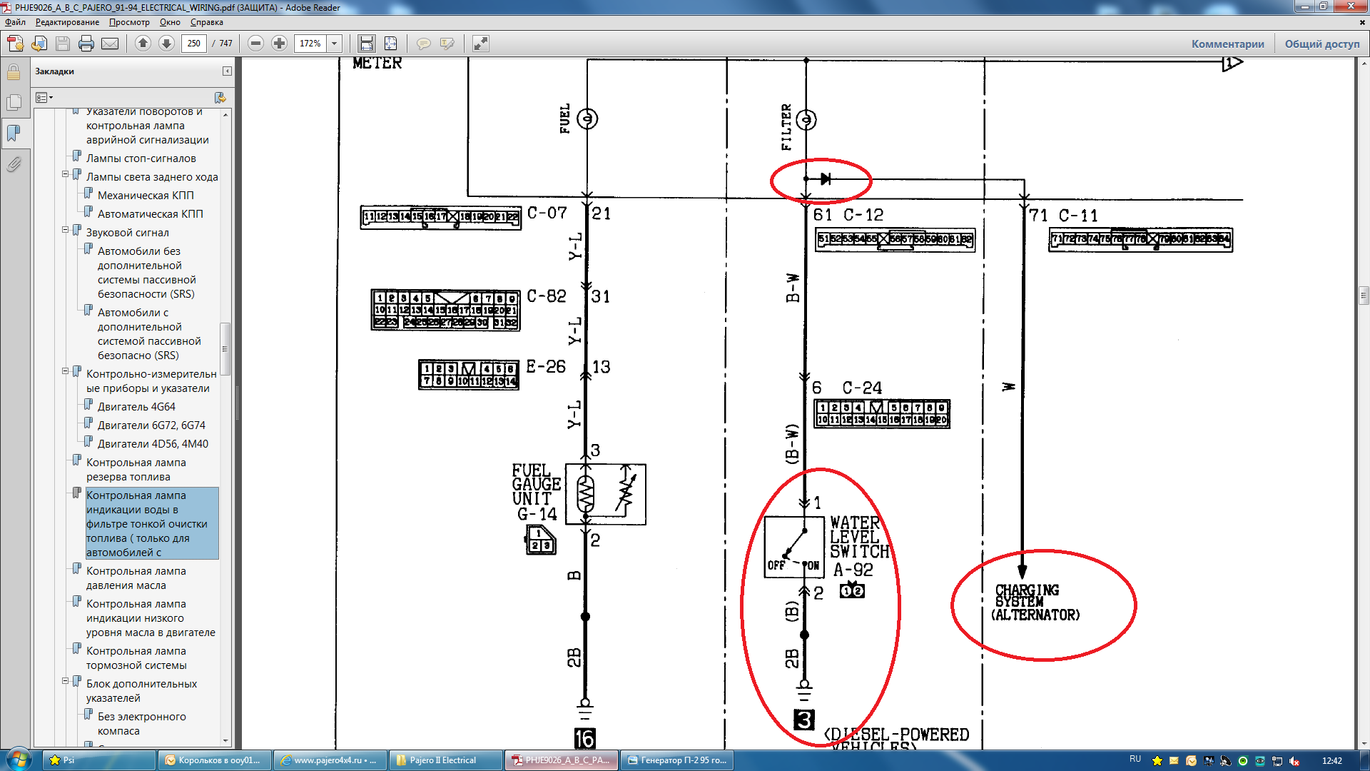 При включении зажигания масса для этих ламп через диоды (на каждой лампе) приходит от генератора (обвел на рисунке) . Там не чистая масса, а вольт-полтора при включении зажигания есть. После пуска там появляется +12В от генератора, диоды запираются и масса приходит уже через соответствующие датчики. Поскольку питание приходит не в полном напряжении (12-1,5=10,5В), то лампочки могут гореть не в полный накал. И чем больше напряжение на выводе 2 генератора при включении генератора (до пуска двигателя), тем меньше будет разница потенциалов для питания ламп и тем более тускло она будет гореть. Поэтому первое, что я бы посмотрел - напряжение точке 2 на генераторе по отношению к массе. Можно померять напряжение на выводах ламы давления масла (именно на выводах, а не на массе и одном из выводов). Потом уже дальше думать.