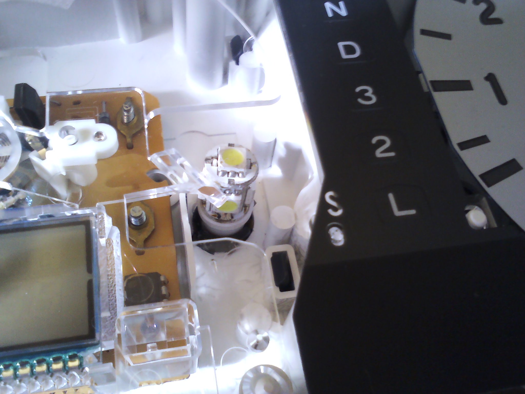 - добавил 4 светодиода так как штатно их просто мало и горит неравномерно просто припаял и вклеил в произвольной форме(не сложно)на фото заменены штатные лампы на свето диоды далее в пустые места добалил 4 светодиода на фото добавленных нет