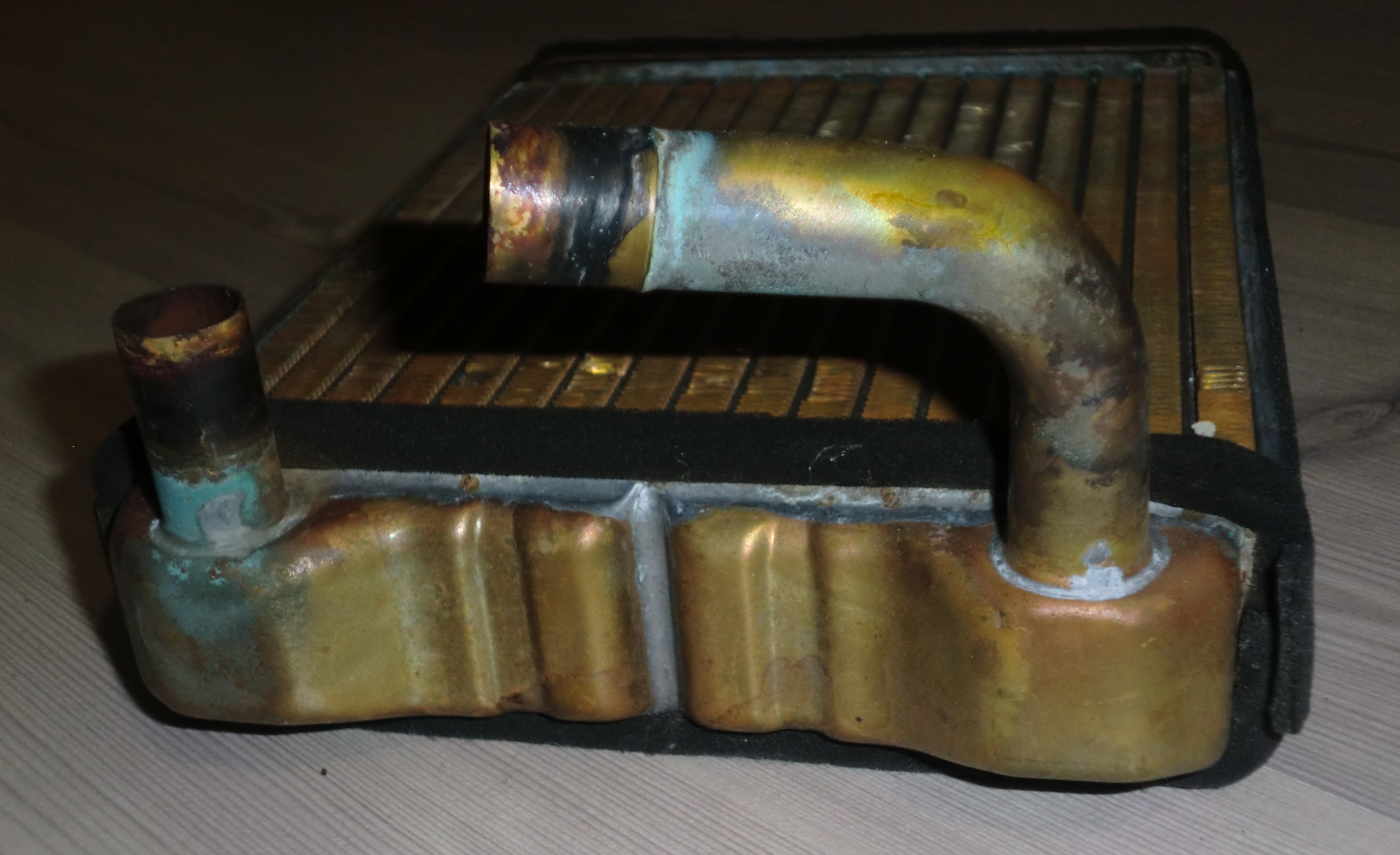 3. Радиатор печки (купил новый и установил, а мой оказался тоже исправным, течь была на соединении резинового соединительного патрубка, на фото видно) - 3.5 т.р