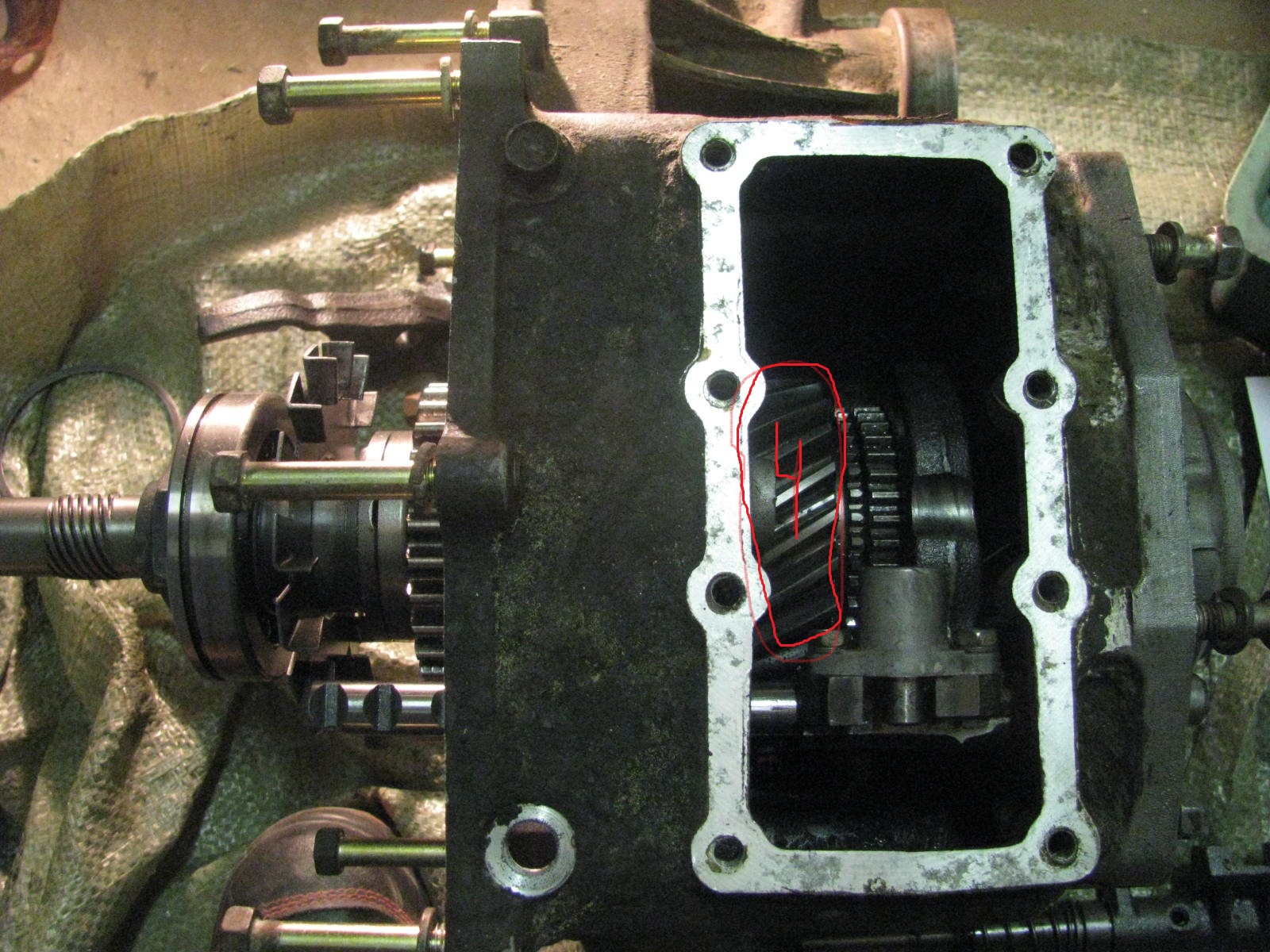 ЗЫ На фотографии рабочее РК в которую я поставил новую цепь и установил на МКПП. Её привёл для примера: красным обведена шестерня 4, которая заклинила по моим прикидкам на выходном валу. Таким образом при вращении выходного вала(его видно слева) на прямой передаче, эта заклинившая шестерня и создала катаклизьм с остановкой всей трансмиссии