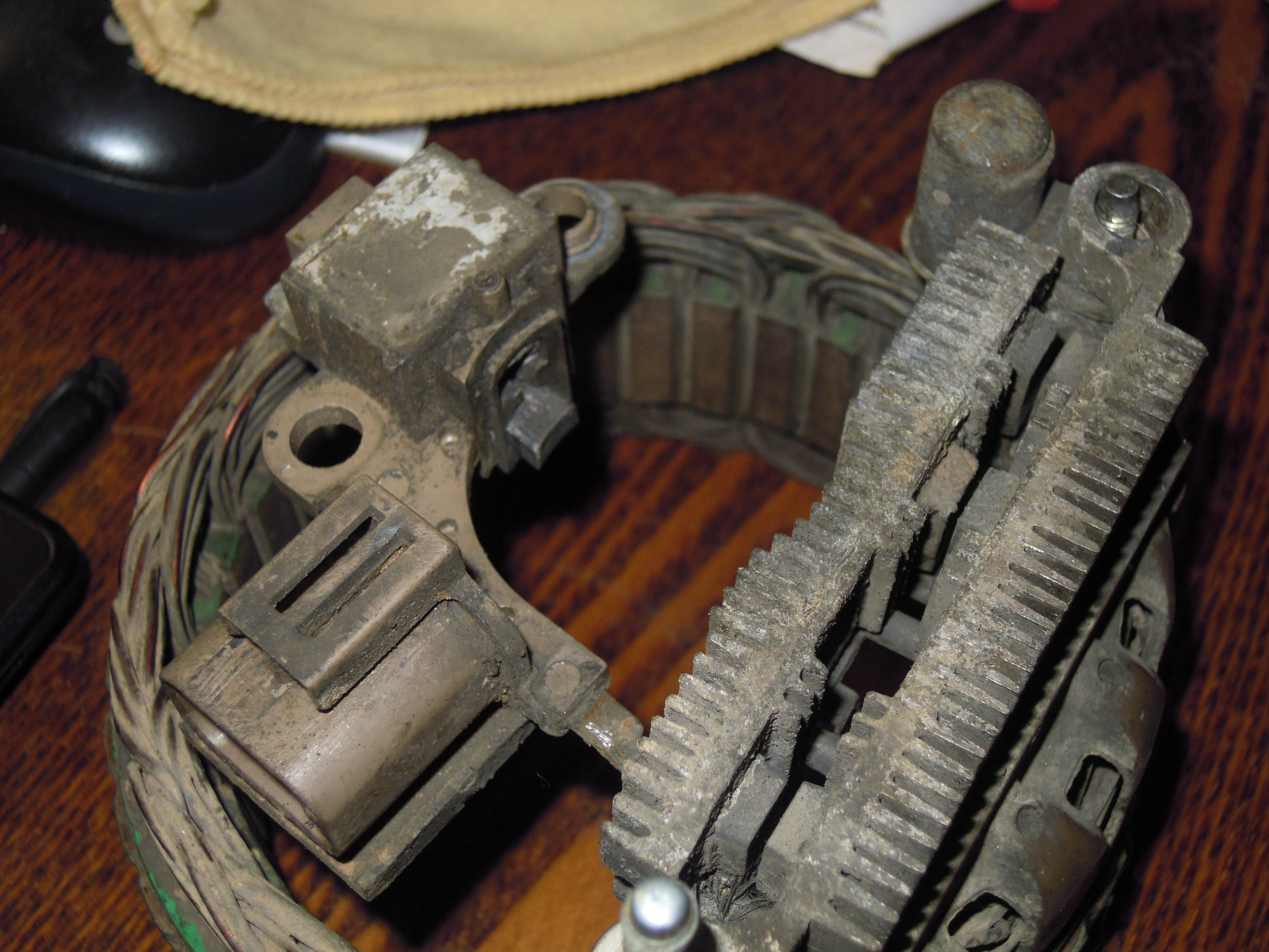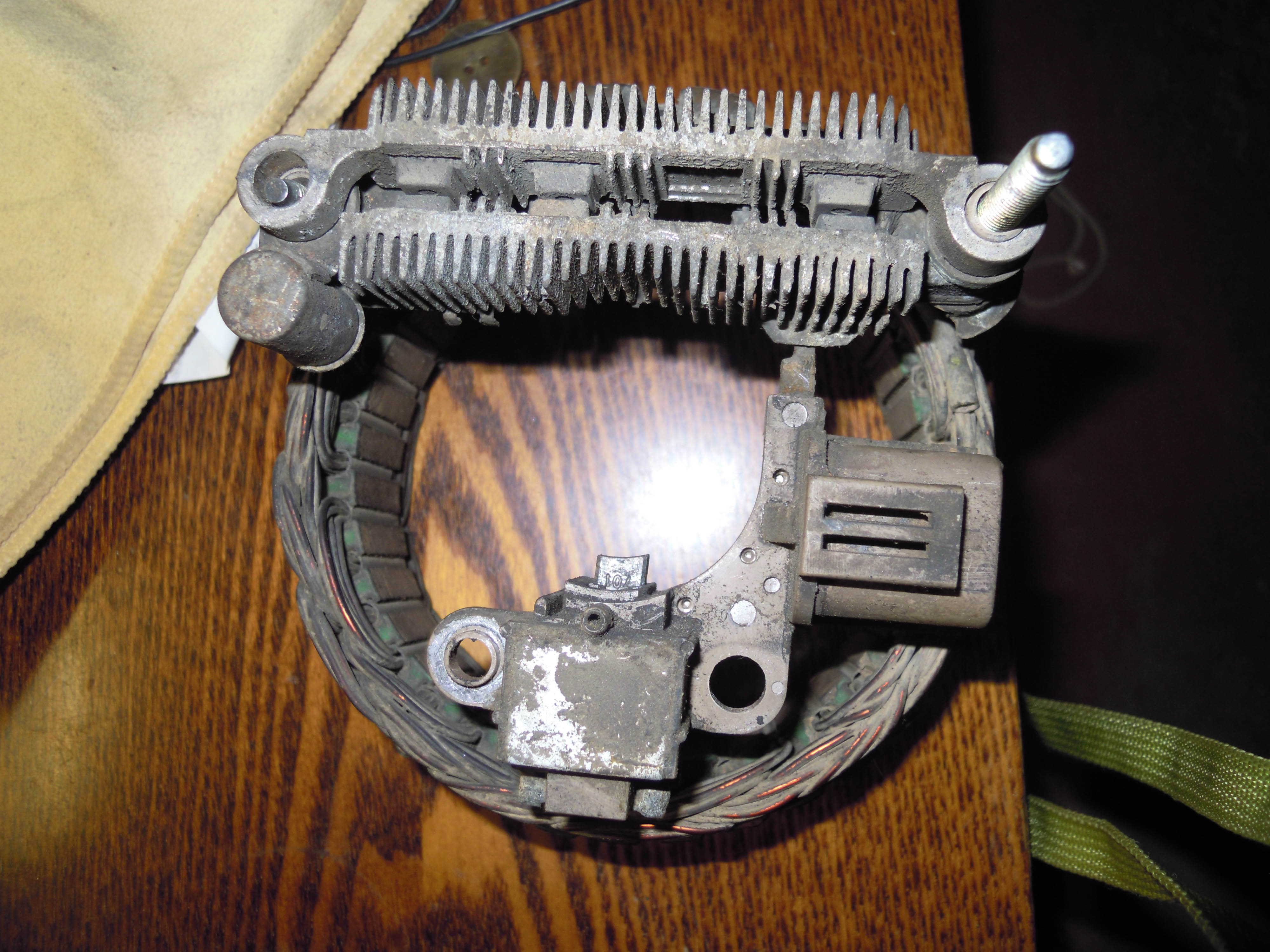 В выложенных на профильном форуме фотках многоуважаемые джиперы опознали генератор Mitsubishi. Теперь мучаюсь перекапыванием каталогов пытаясь определить конкретную модель генератора и электронных девайсов в нем установленных. По каталогам похожих мостов и регуляторов хватает, но точно определить их модели не могу. Был бы очень благодарен за помощь в опознании электронных компонентов.