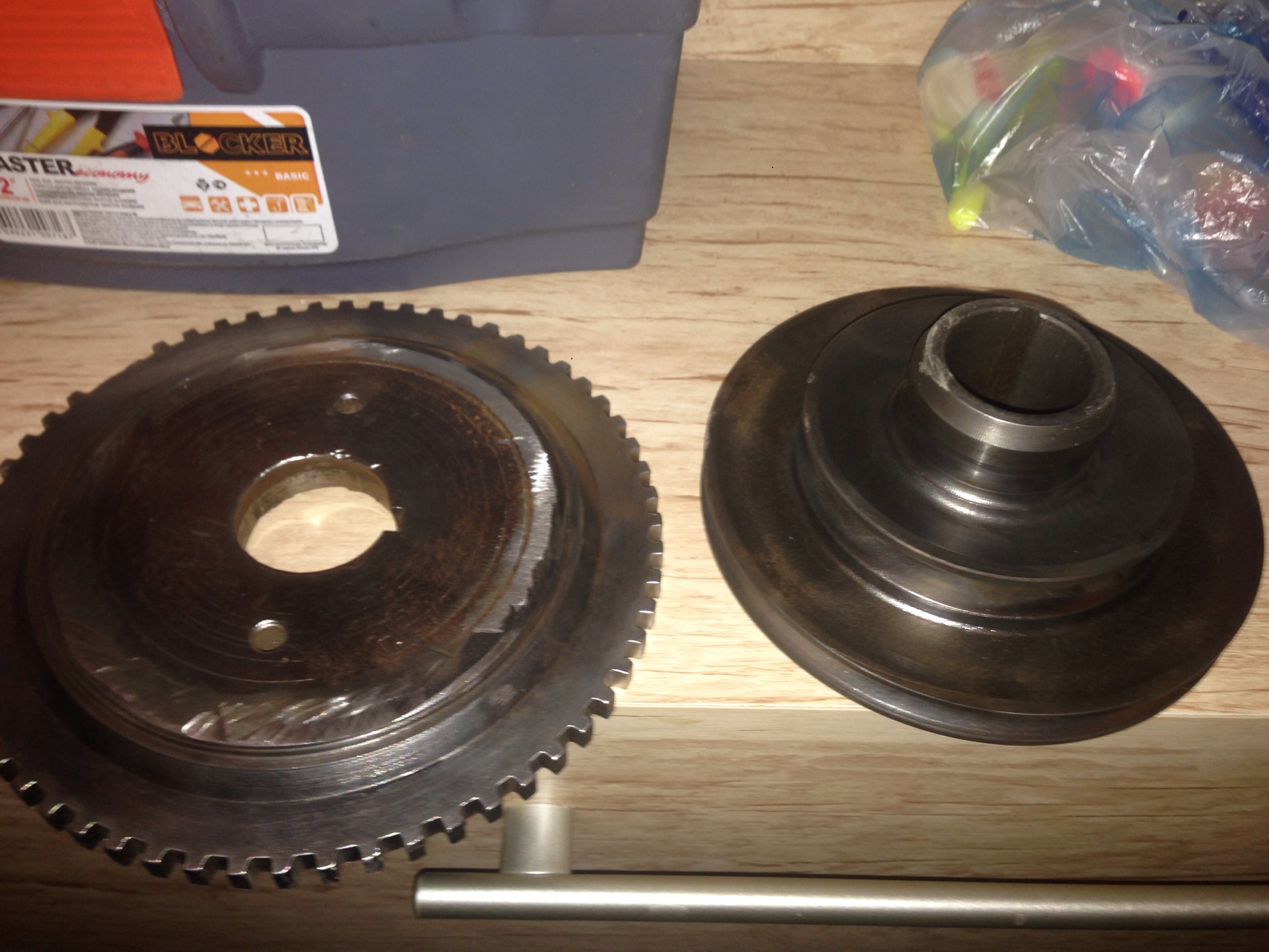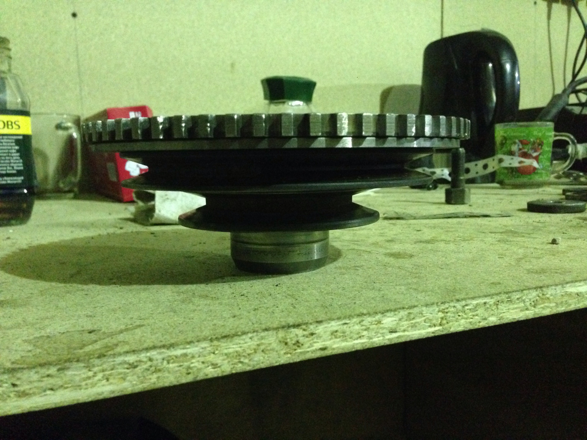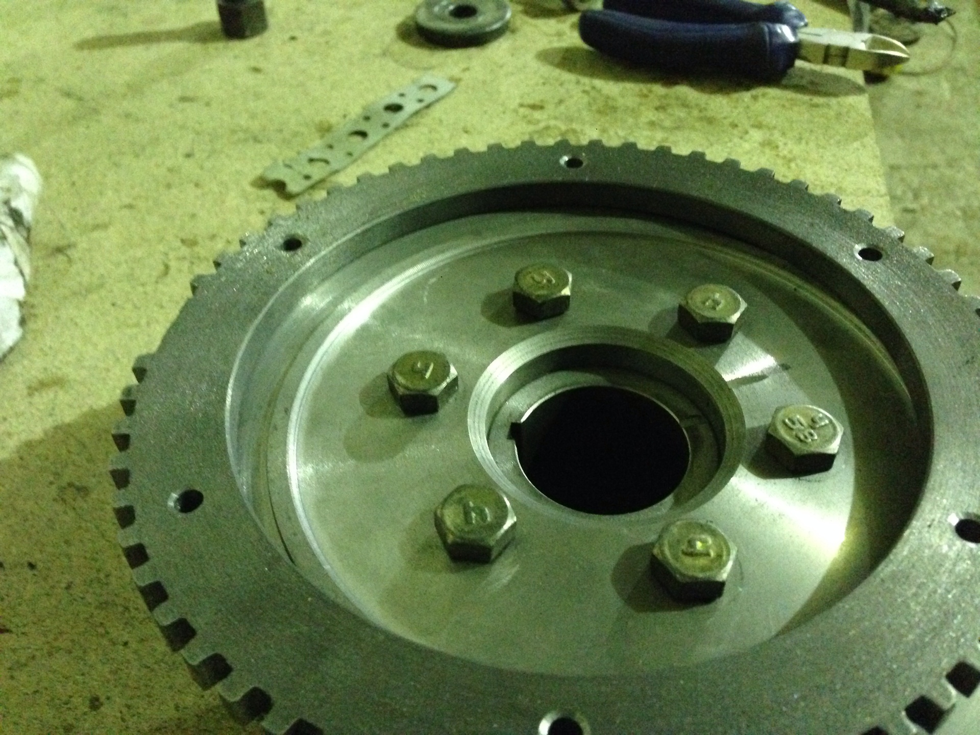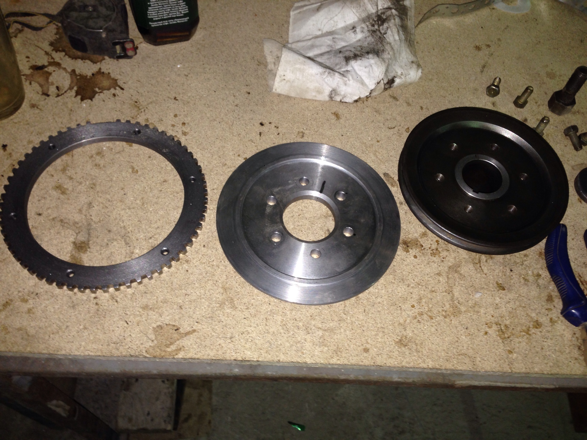 Для начала приобрёл шкив коленвала от 406-го волговского мотора. От него было отрезано всё лишнее Всё отдал в токарку, на выходе получил: