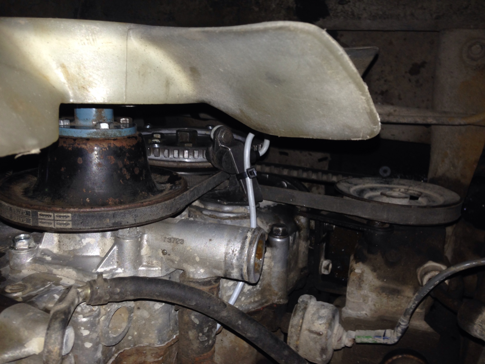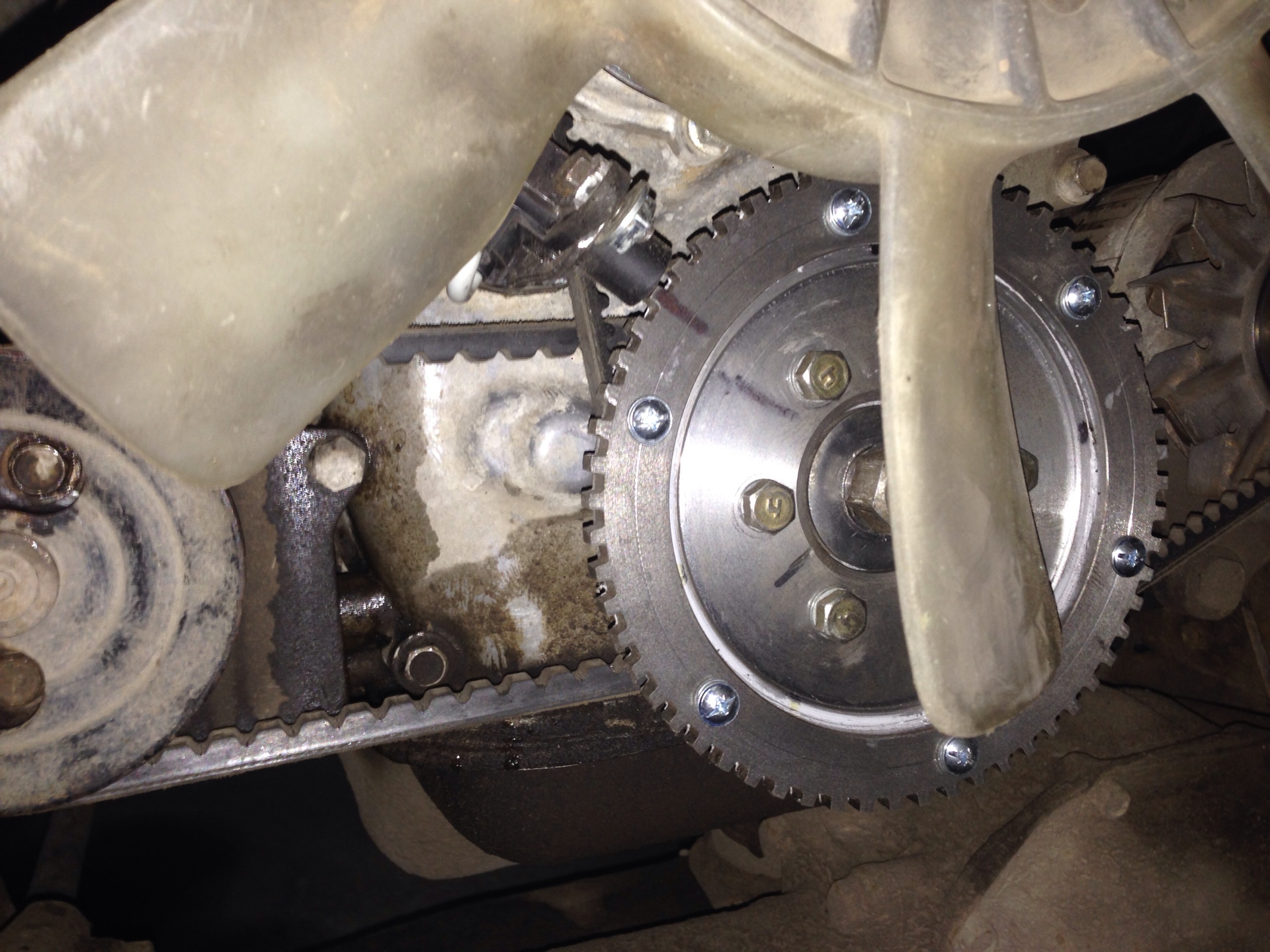 Конструкцию эту в итоге пришлось изрядно попилить и переделать, т.к. после кропотливой подгонки зазора между репером и датчиком мне наконец-то пришла светлая мысль (вот дебил))) поставить на место ремни, и тот, который, собака, на помпу с генератором проходил акурат по центру кронштейна