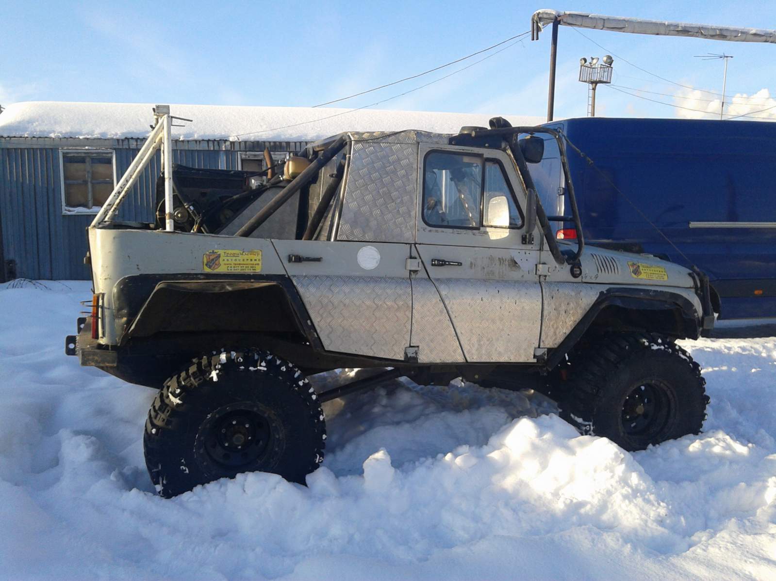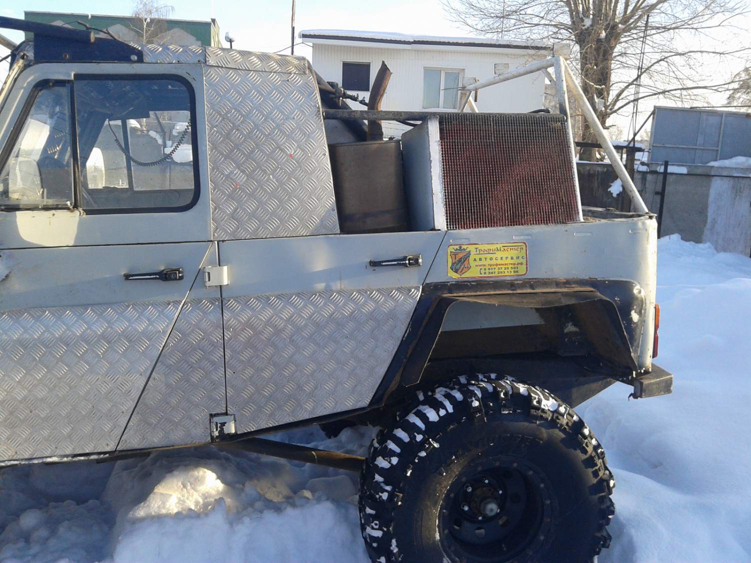 Радиатор и выхлоп сзади слева вверху. Главаная дуга безопасности, простая сталь.