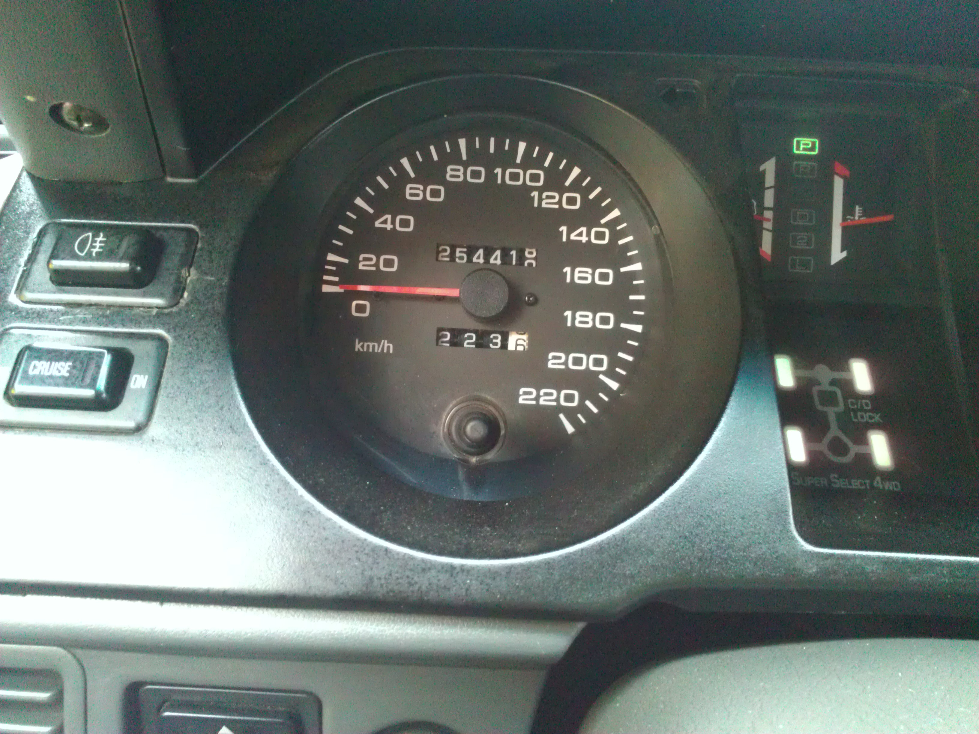 Полный привод суперселект, задняя блокировка, регулируемая подвеска работает. Есть рейлинги, что для 3х дверки большая редкость. Кондиционер теоретически есть, но не хватает трубки, может быть ещё чего-то (будем считать, что его нет). Омыватель фар.