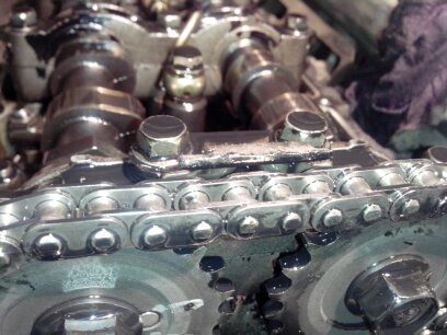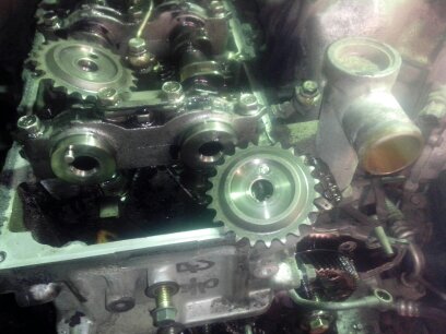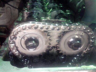 Утром вскрыл клапанную крышку, от оно! оборван успокоитель. Всё остальное в норме и на месте. Совместить метки на обеих звёздочках и на цепи не получилось, снял лобовину, выставить все метки во всех местах не получилось. Понятно - перескочила , видимо кусок успокоителя помог. Снимаю звёздочки - на правом распреде срезан штифт... Кто его срезал? Кроме поршня и клапана некому. Снял голову - следы контакта есть, но больше похожи на следы похлопывания, как по попе ладошкой. Вот весь анамнез ,так сказать. Далее ремонт и вопросы к опытным эксплуататорам. Ах да, -фото.