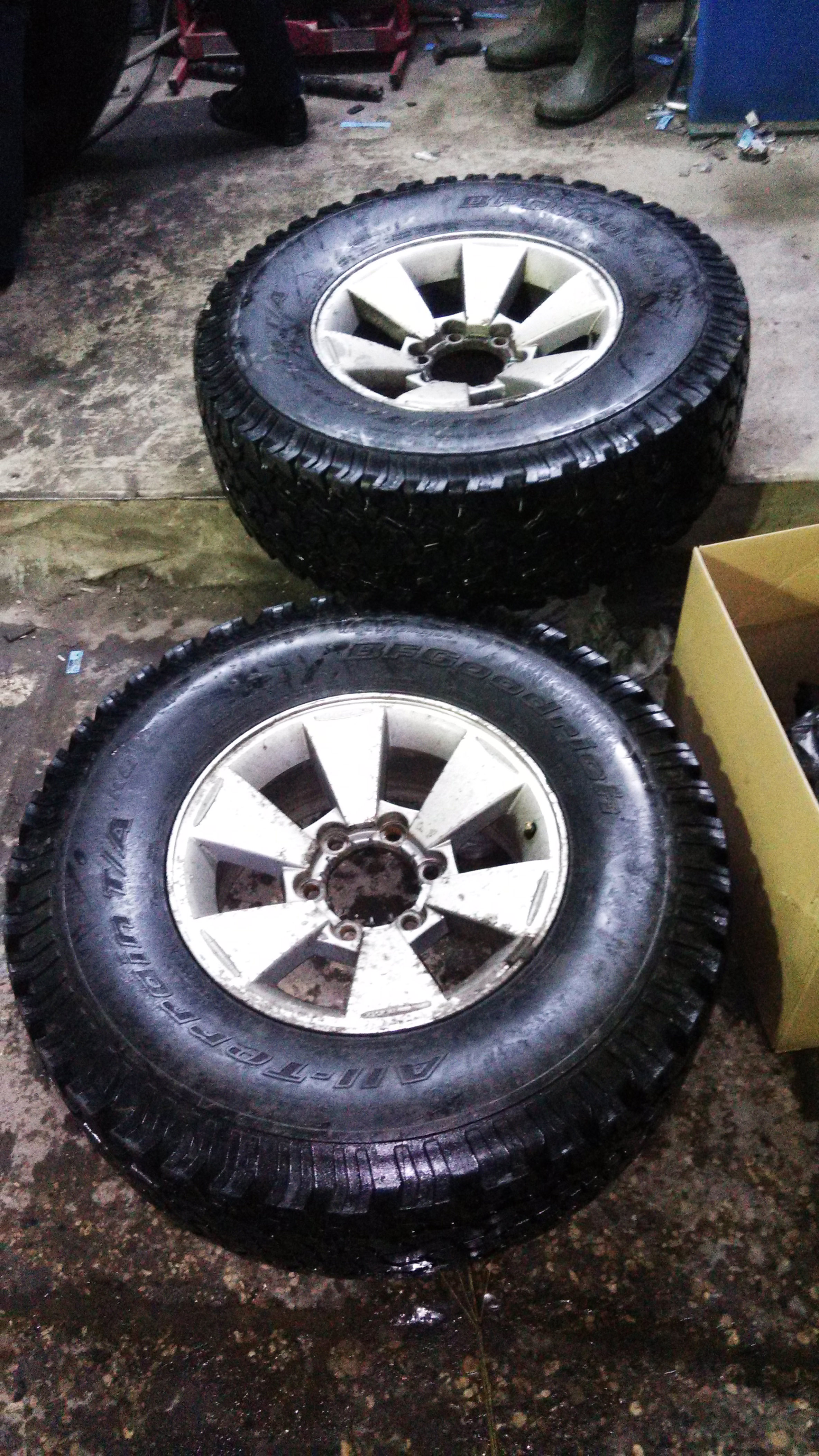 Продам 4 шины (без дисков) BFG AT 265/75/16. Пробег не знаю, купил машину с ними. Остаток миллиметров 7. Изнутри подробно в шиномонтаже не успел рассмотреть, но вроде все без проколов, давление по-крайней мере держат нормально.