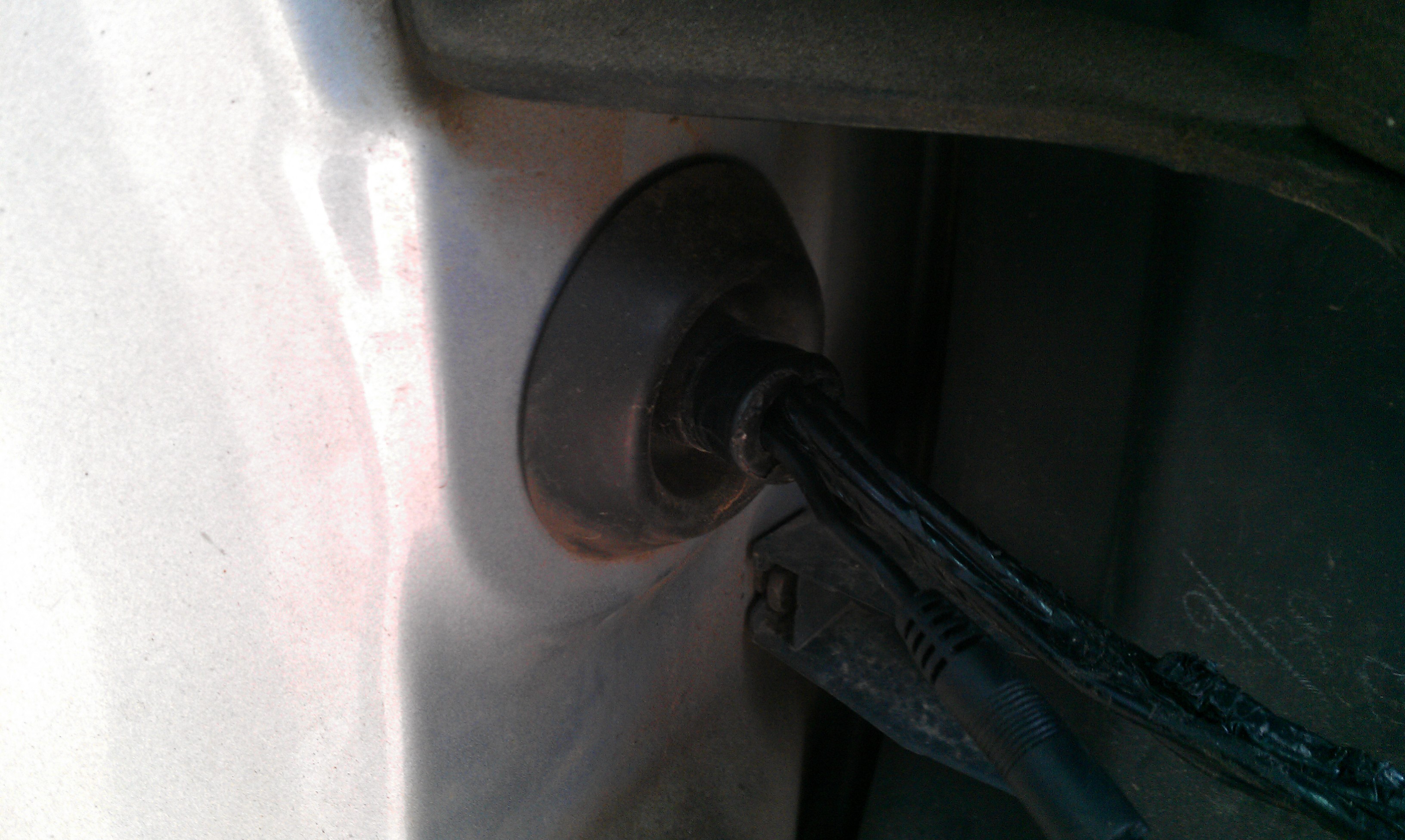 Делаем отверстие под форсунку при помощи дрели предварительно измерив диаметр трубки одетой на форсунку (около 8мм). Вставляем форсунку. Одеваем на нее трубку и настраиваем направление струи. Для этого набираем в рот воды и имитируем моторчик омывателя. После того как процедура выполнена основательно крепим форсунку и одеваем на нее трубку, которую в свою очередь прокладываем по каркасу кожуха запаски.