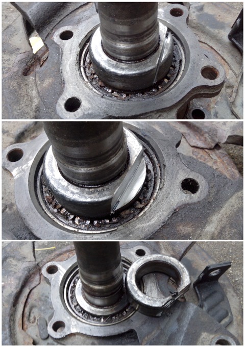 — отсоединяем тормозной шланг суппорта от тормозной магистрали и откручиваем полностью тормозной суппорт в сборе. Теперь откручиваем (4 гайки) полуось в сборе от чулка моста и аккуратно вытягиваем полуось дабы шлицами не повредить кромку внутреннего сальника полуоси, хотя учитывая что в данный узел доступ довольно редкий, рекомендую поменять и этот сальник. Аккуратно поддевая отверткой снимаем с полуоси ротор датчика вращения колеса, ABS (у кого он есть) и видим стопорное кольцо, распорную втулку и подшипник. Извлекаем шпильки. (по мануалу предлагают тольку одну, чтобы болгарить можно было) Снимаем стопорное кольцо. Приступаем к извлечению распорной втулки, которая является одноразовой, то есть извлекается она только с помощью жены болгарина и после установки подшипника распорная втулка устанавливается новая. Распорная втулка извлечена. Теперь извлекаем подшипник с помощью специального съемника.( у меня такого съемника нет, буду выбивать) Данным съемником выдавливается полуось из подшипника, а после подшипник с помощью пресса извлекается из корпуса подшипников.