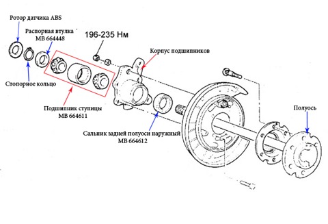 После, берем новый подшипник MB 664611 или Koyo 46T080805CS70 — это один и тот же подшипник и запрессовываем в корпус подшипников. Берем новый наружный сальник MB 664612 и устанавливаем заподлицо с корпусом подшипников (перед установкой сальника наносим на наружную поверхность сальника консистентную смазку) Запрессовываем полуось в корпус с новым подшипником, нанося смазку между сальником и подшипником, а также на поверхности роликов подшипника. Запрессовку новой распорной втулки японцы рекомендуют с помощью пресса с номинальным значением начальной запрессовки 49000Н и окончательным усилием 108000Н. Но многие специалисты используют способ нагрева распорной втулки газовой горелкой или феном и самостоятельным усаживанием втулки на полуось.