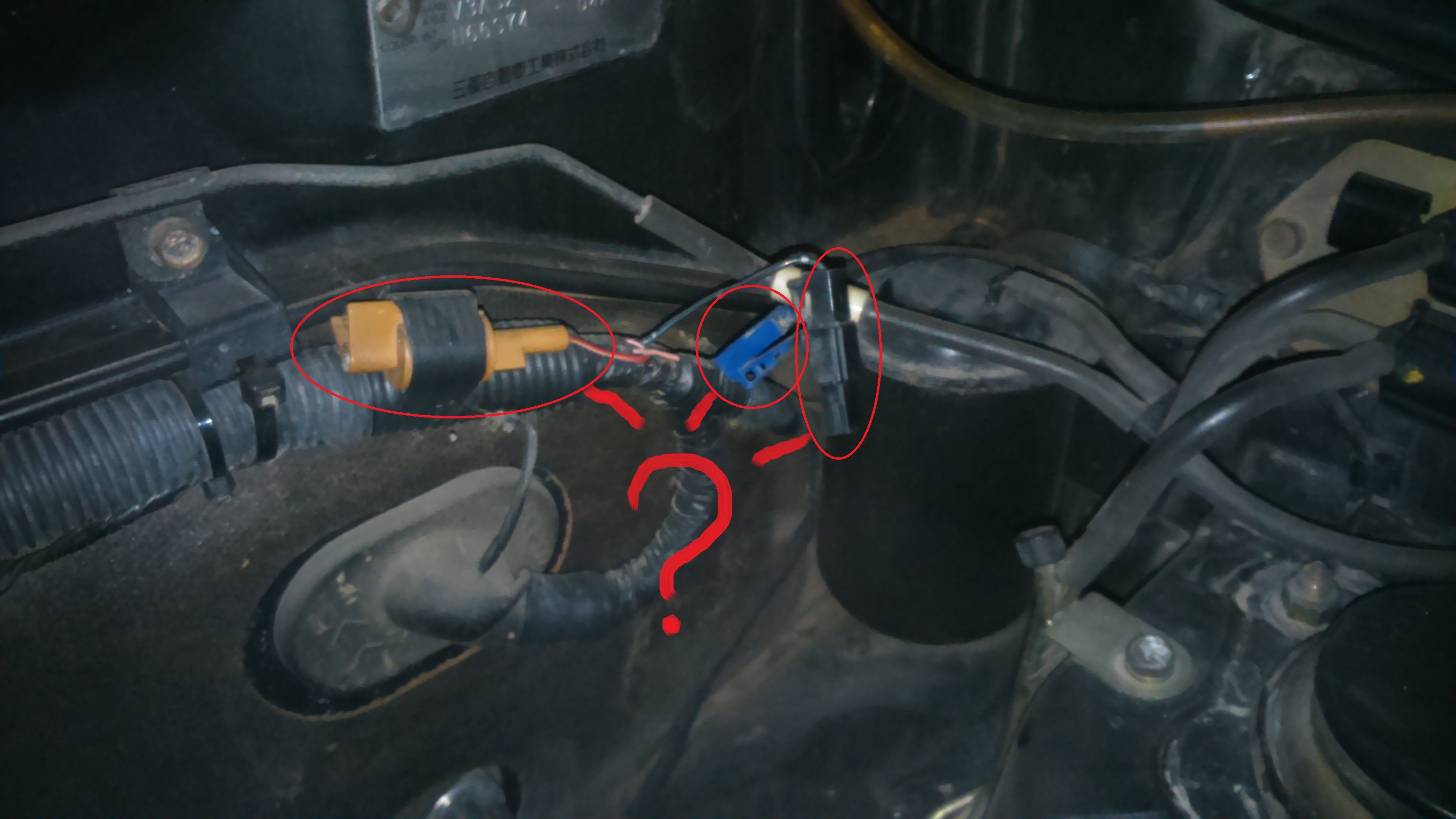 Значит сразу видно что акб у тебя стоит другой полярности чем нужно и плюсовой провод тесновато с окружением расположен. Как раз ниже предохранителя ABS корпус термостата. На нём два датчика (с одним проводом и с двумя). Посмотри контакты и провода на том датчике,что с двумя контактами,он важен для запуска,а у тебя там идёт проводка от АКБ