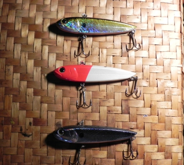 Два воблера не помню какой фирмы, покупались в Прибалтике, плавающие, шумящие. Большой 24 г., длина 16 см., с французскими тройниками CANNELLE, поменьше 15 г. , длина 13 см, с японскими тройниками. Отличное качество.
