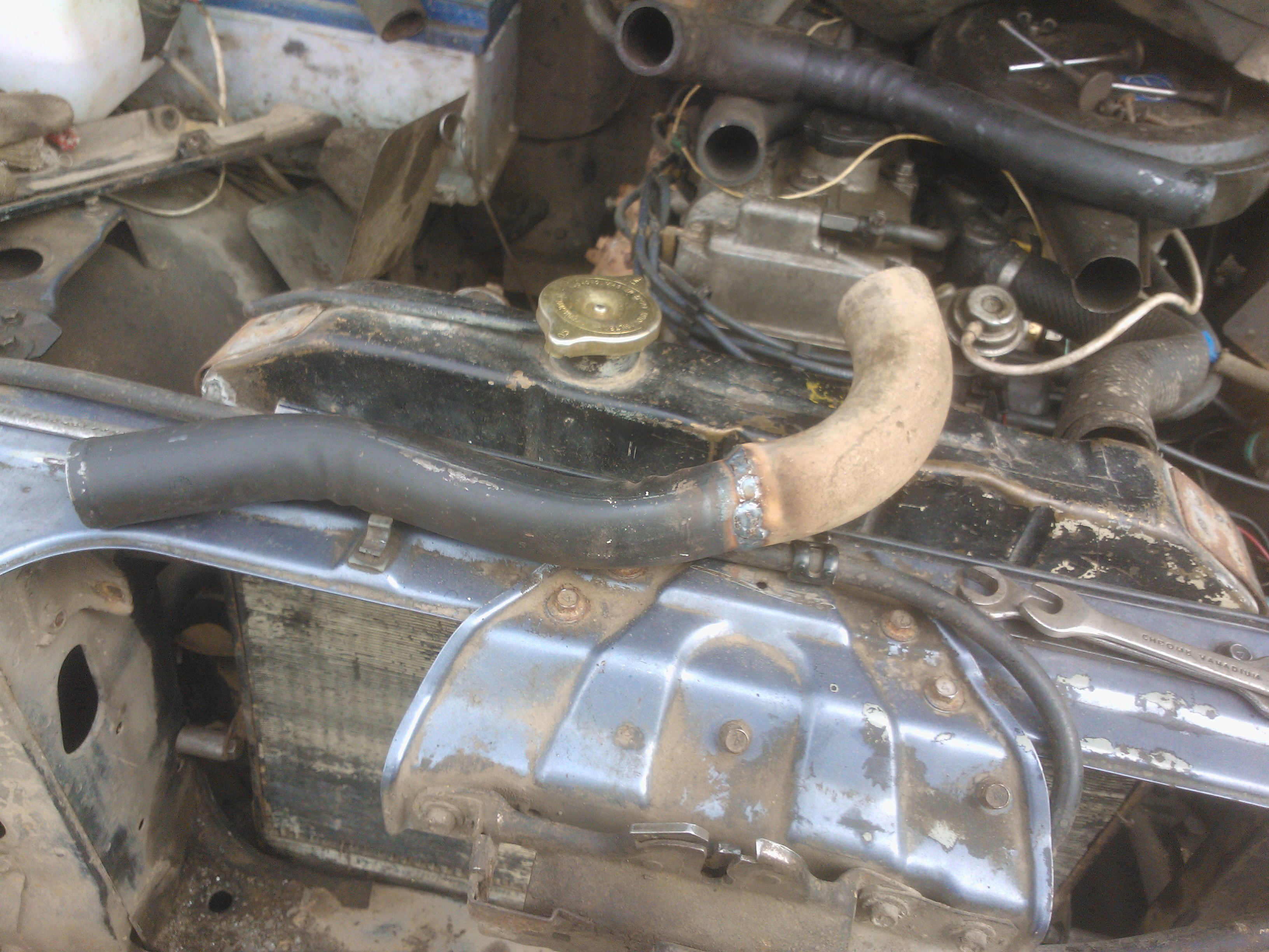 К одному из них привариваем кусок глушителя от неизвестно чего (нижний патрубок радиатора шире),второй наверх идет без переделок. И,вуаля!!!!Все фунциклирует!!!