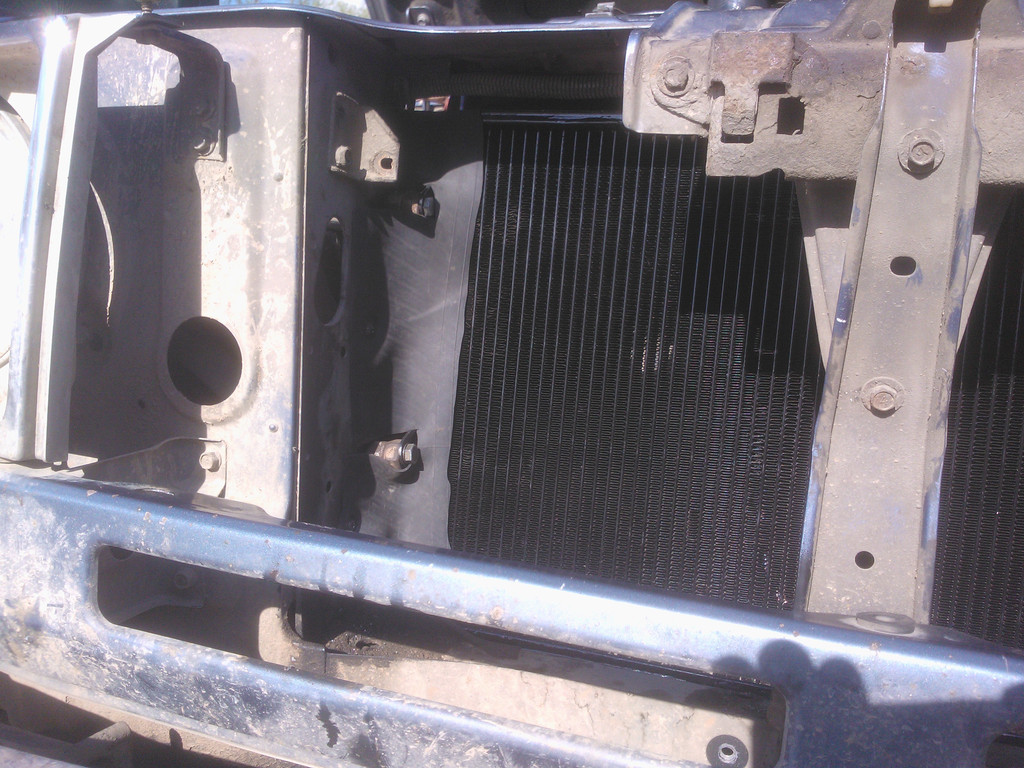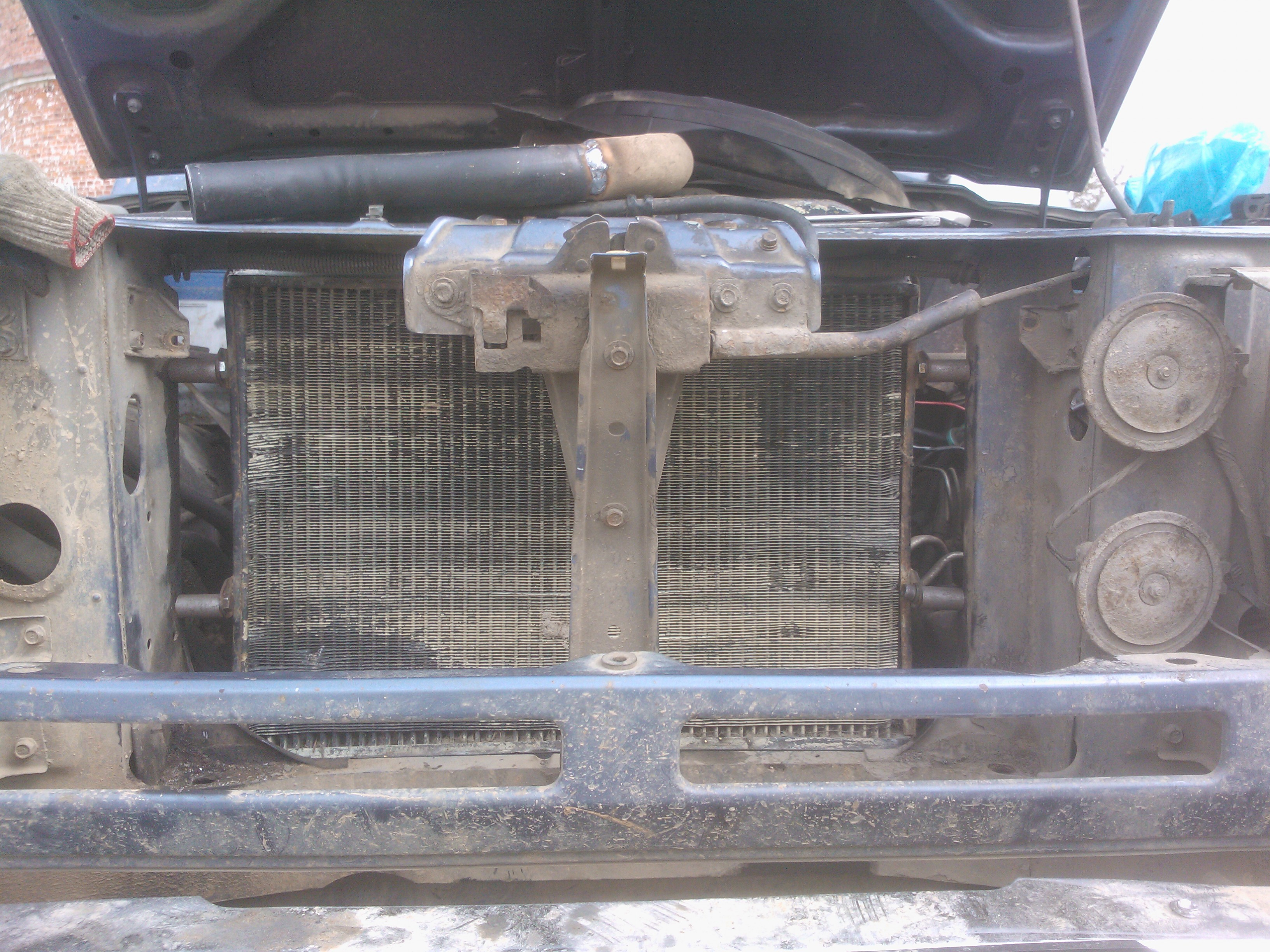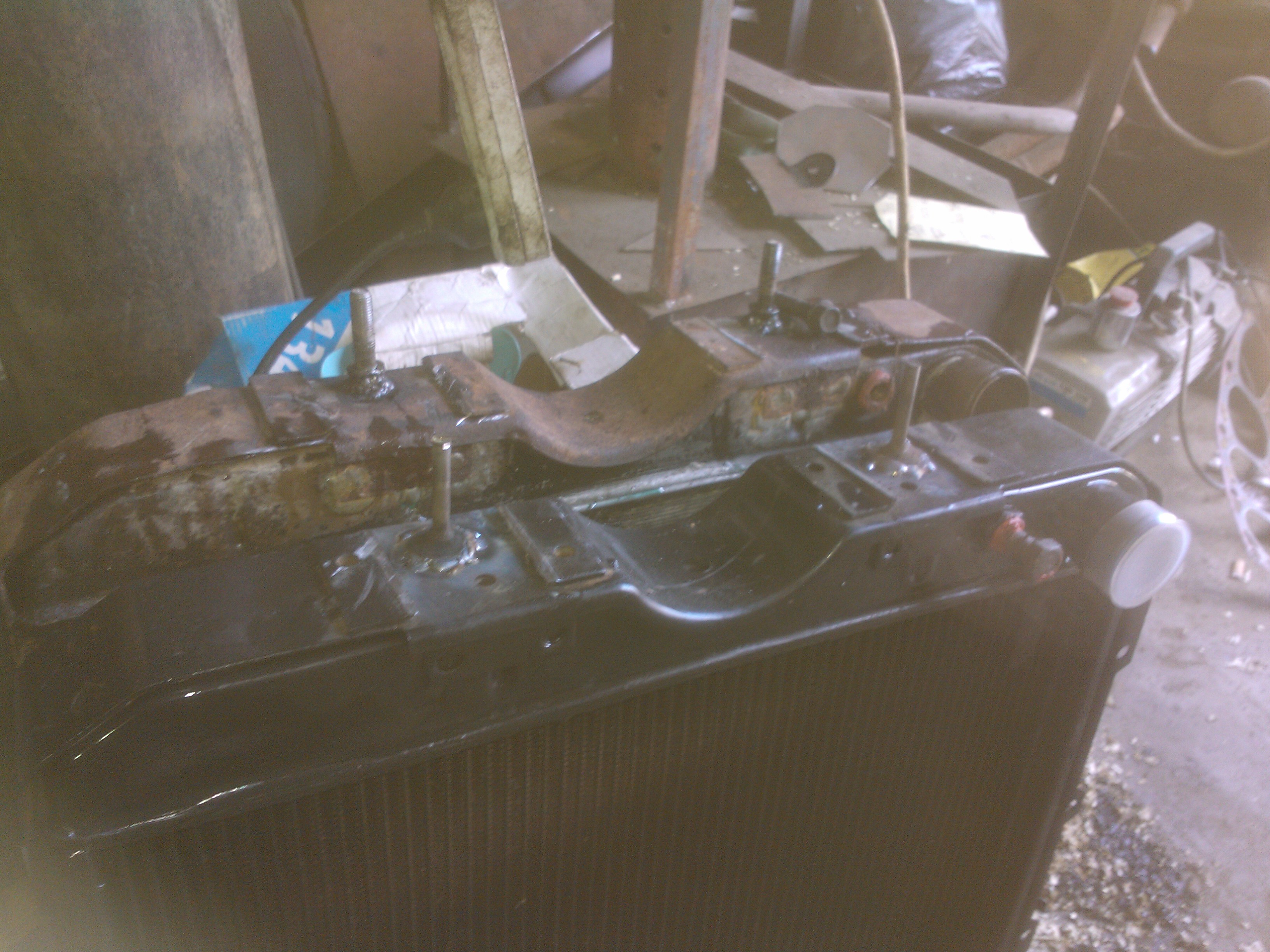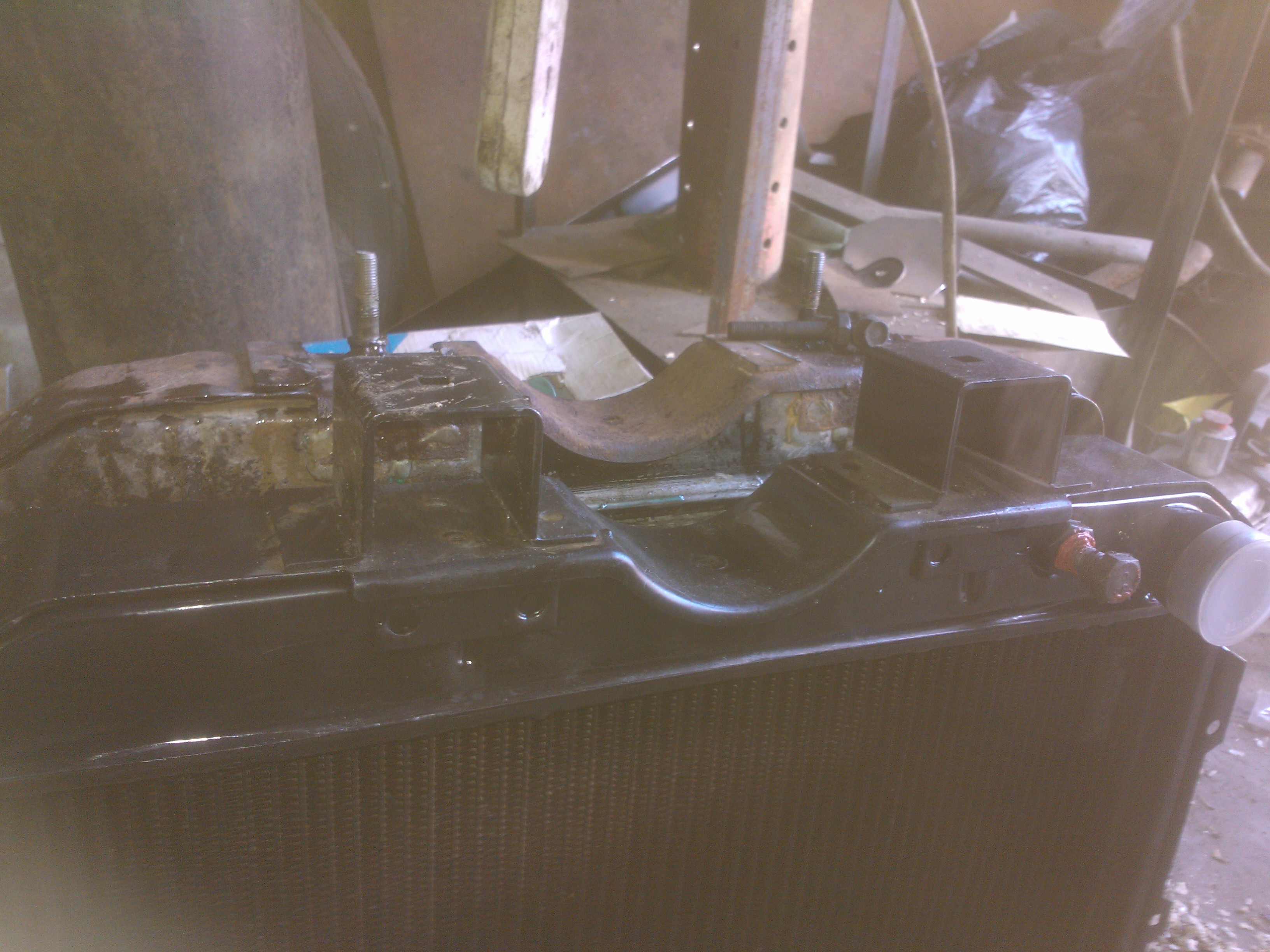Теперь по переделкам.С уазовского срезаем нижние кронштейны,их же,предварительно разрезав,привариваем к кузову.К радиатору привариваем два болта(направляющие) под резинку. Самое сложное приварить так,что бы они точно попали в отверстия свжеприваренных уголков.Ставим радиатор,размечаем по бокам отверстия под уазовсие крепления,сверлим,прикручиваем через проставки,боковины закрываем полосками резины. В родном кожухе по новой сверлим отверстия и прикручиваем к радиатору.