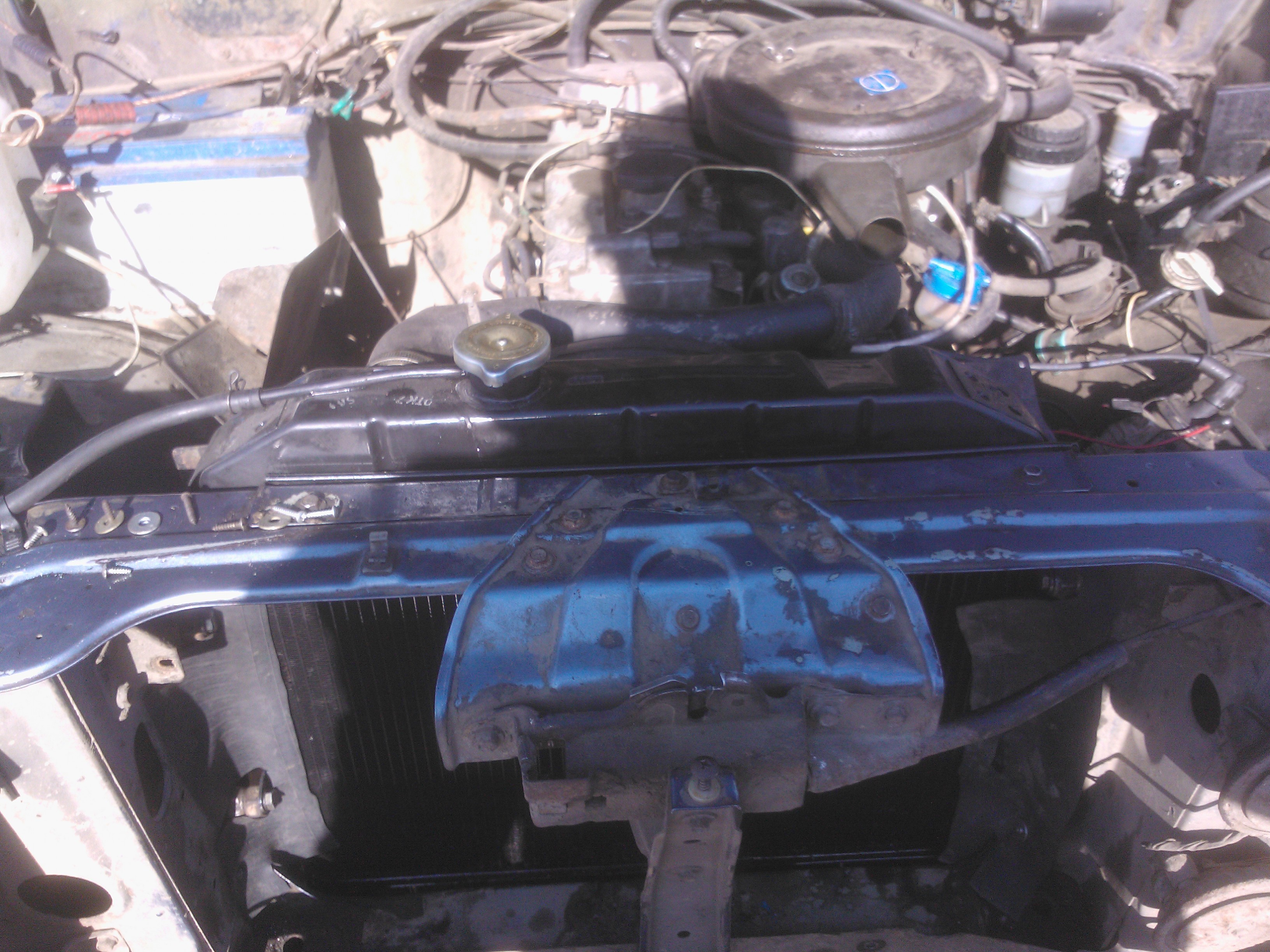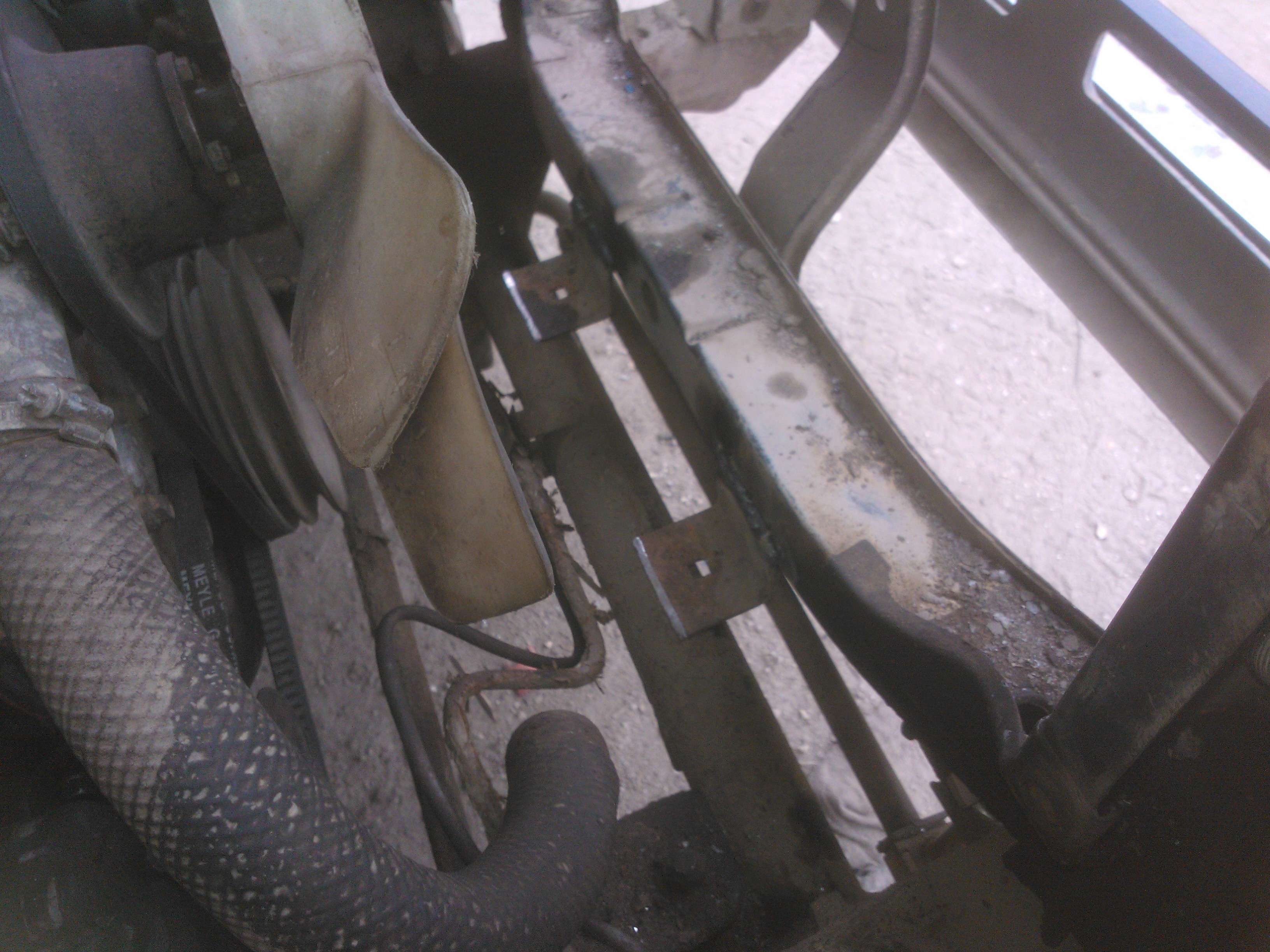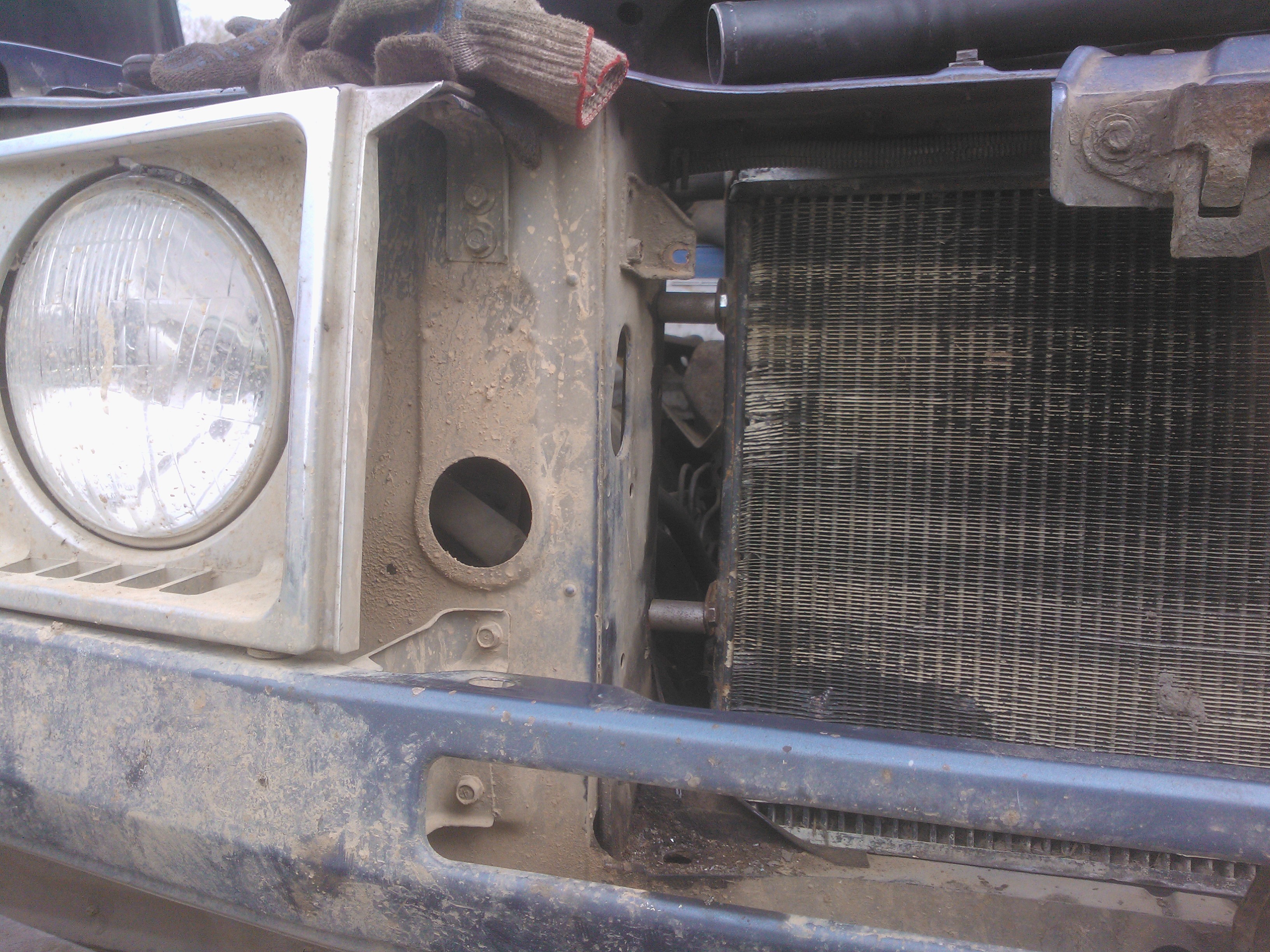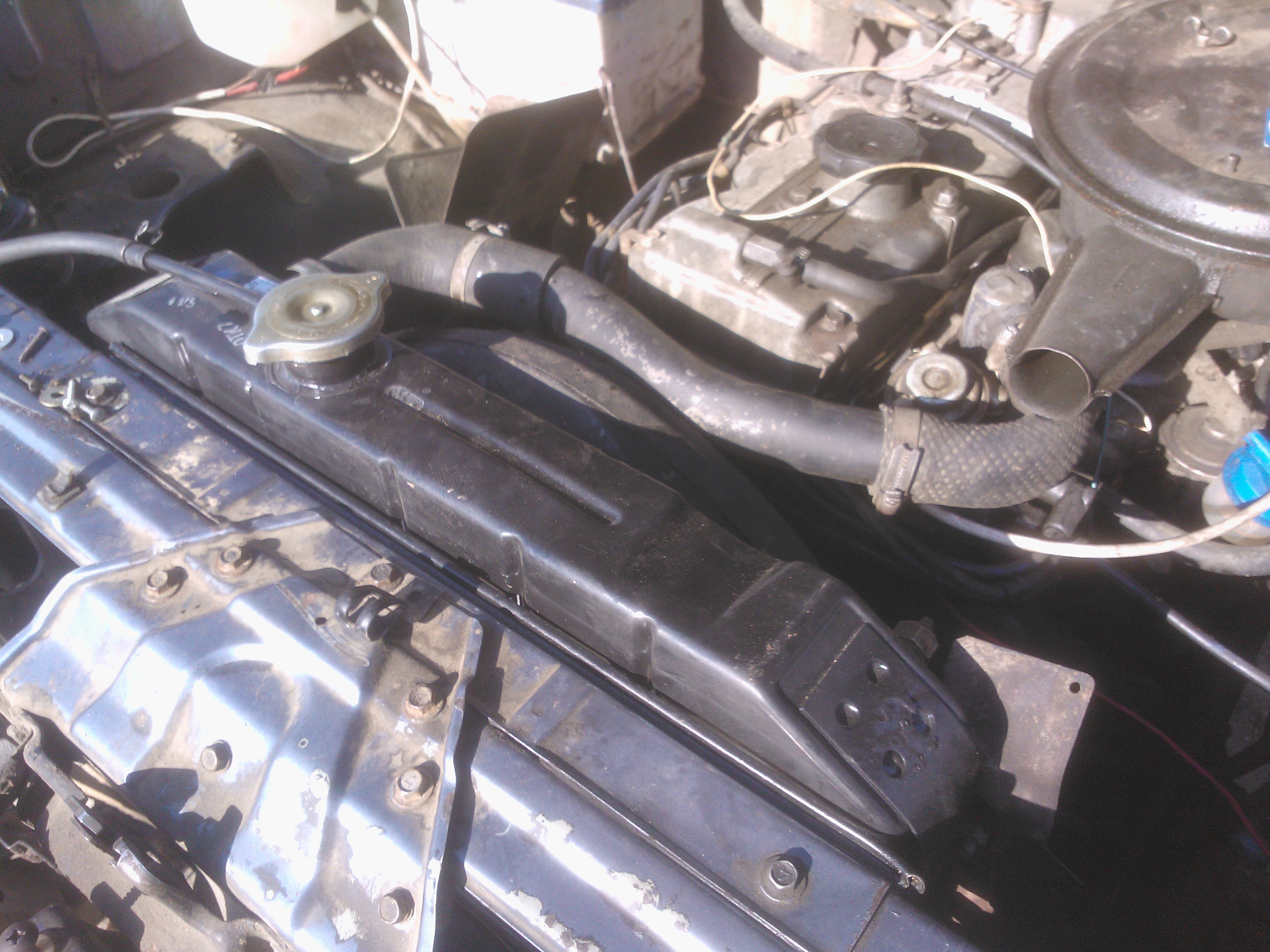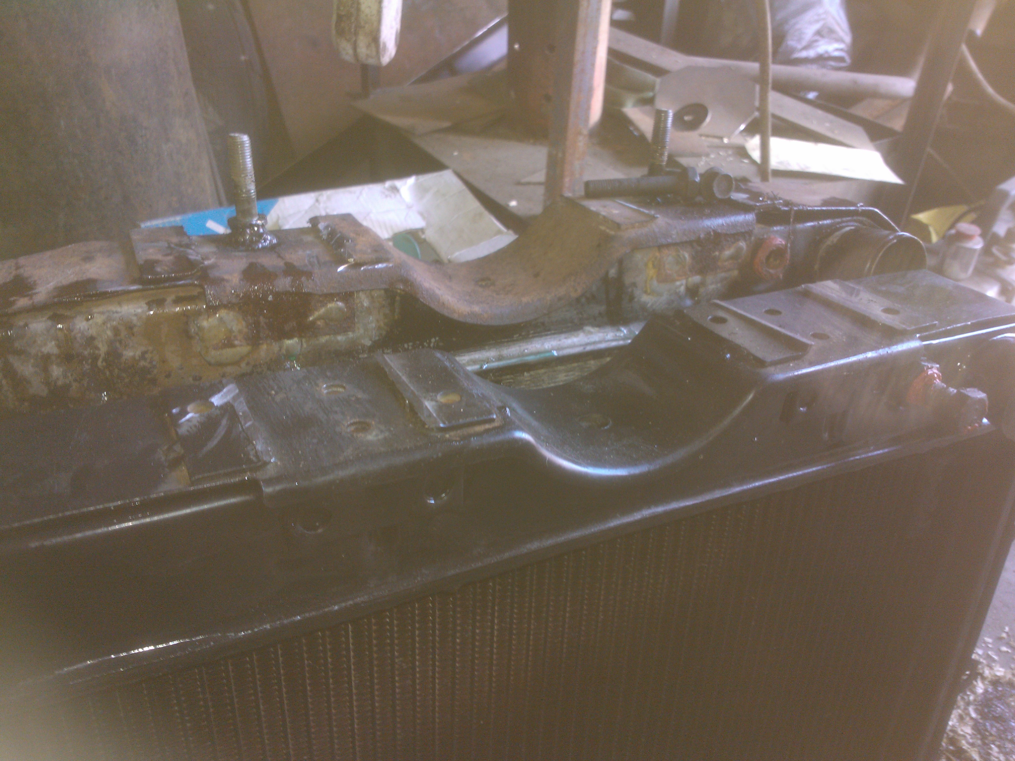 Теперь по переделкам.С уазовского срезаем нижние кронштейны,их же,предварительно разрезав,привариваем к кузову.К радиатору привариваем два болта(направляющие) под резинку. Самое сложное приварить так,что бы они точно попали в отверстия свжеприваренных уголков.Ставим радиатор,размечаем по бокам отверстия под уазовсие крепления,сверлим,прикручиваем через проставки,боковины закрываем полосками резины. В родном кожухе по новой сверлим отверстия и прикручиваем к радиатору.