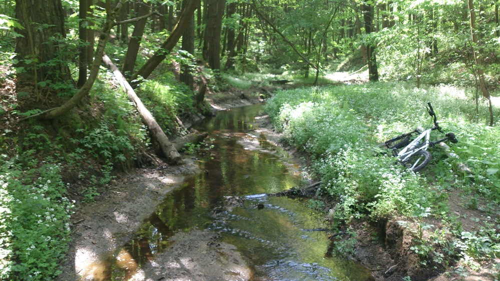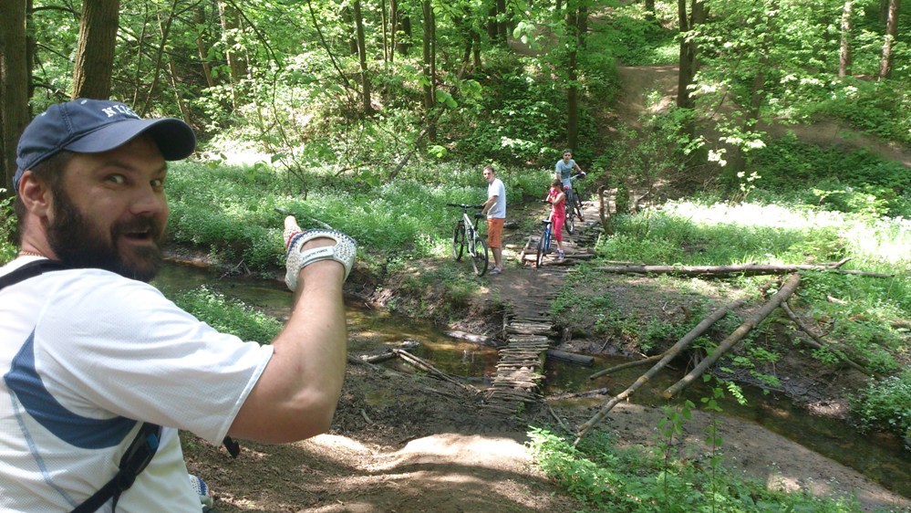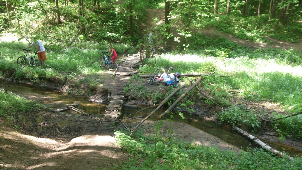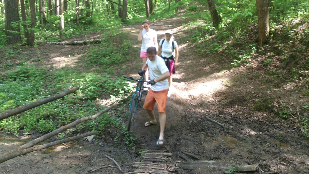 и он укоротив её на 15 звеньев героически ,на двух передачах продолжил наш путь!Также приключения не обошли Митяя стороной,на спуске к речке он не расчитал траекторию и мальца убрался
