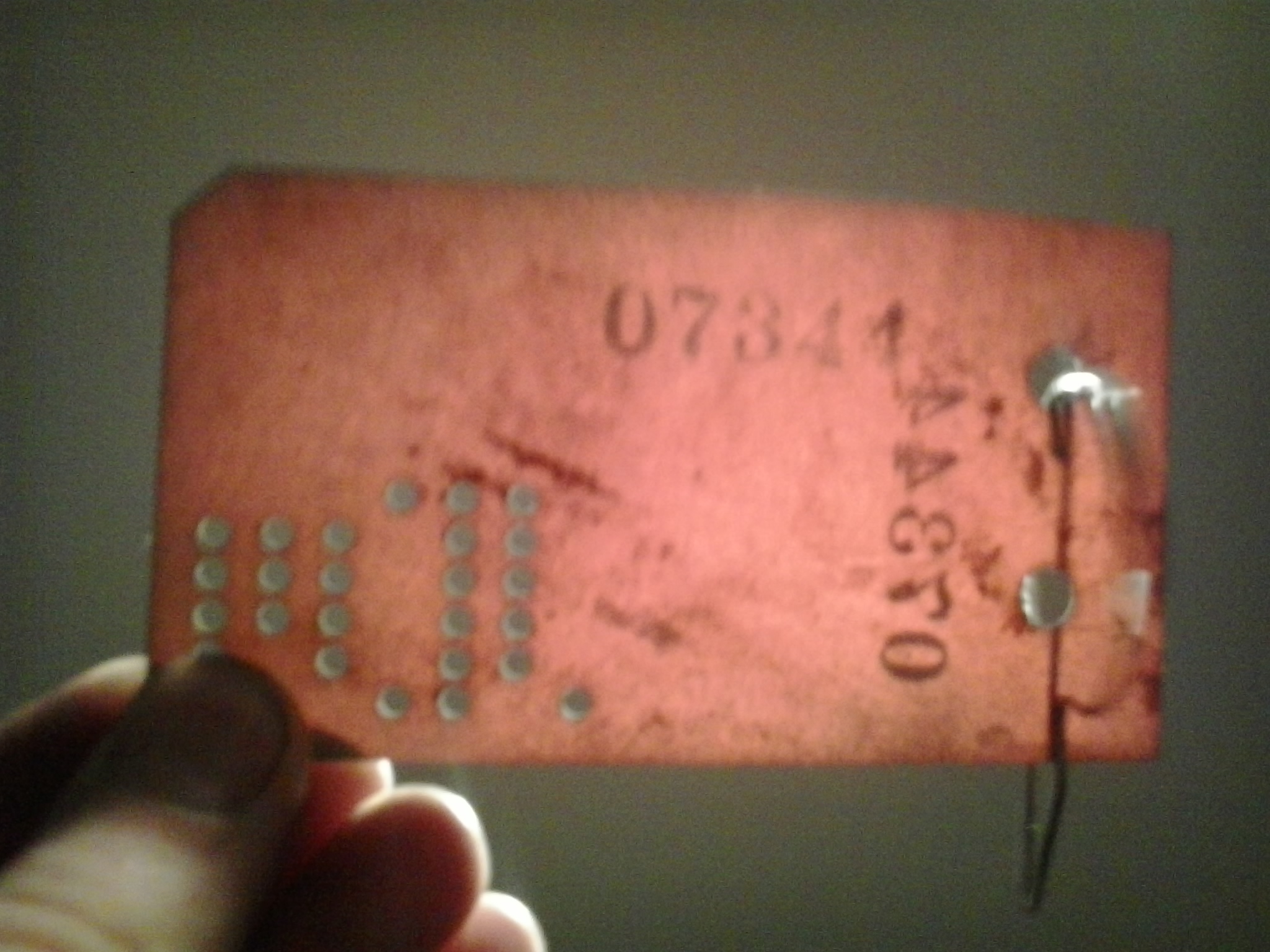 потянув за колечко вылезла какая-то табличка. выполнена она из типо текстолита, с одной стороны покрашена в цвет кузова. с обоих сторон нанесены цифры. с окрашенной стороны они видны на просвет. ну и перфорация имеется.