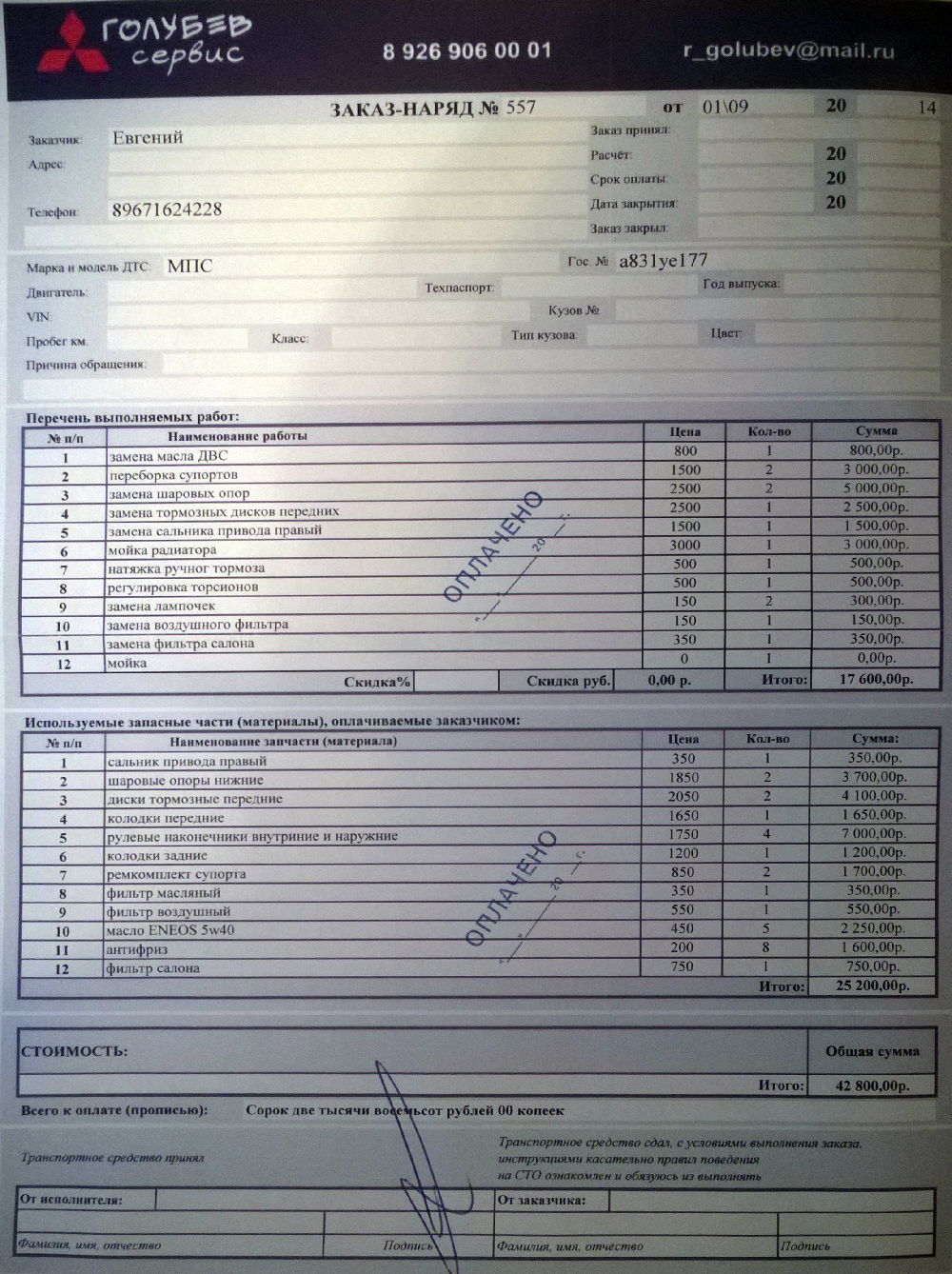 Итак, принял решение сделать зазыр сервисов по порядку. Съездил по самой первой рекомендации, обслуживание неплохое, ничего не могу сказать отрицательного, хотя сам сервис весьма далеко от меня. Ко мне, как клиенту, ребята были очень внимательны. Единственное, с чем вышел промах (скорее моя ошибка) - это стоимость запчастей. Работы вышли на 17 600, запчасти на 25 200, итого 42 800 за пол дня работы (с утра сдал, днем забрал, это плюс, что так оперативно). Некоторые мелочи сделать не смогли по причине отсутствия запчастей и другого профиля задач (это не камень в огород сервиса). Кому интересно, прикладываю перечень работ. Кстати, в подарок сделали полную мойку машины, включая багажник и салон, а так же дали наклейку, которая дает 10% скидки в будущем.