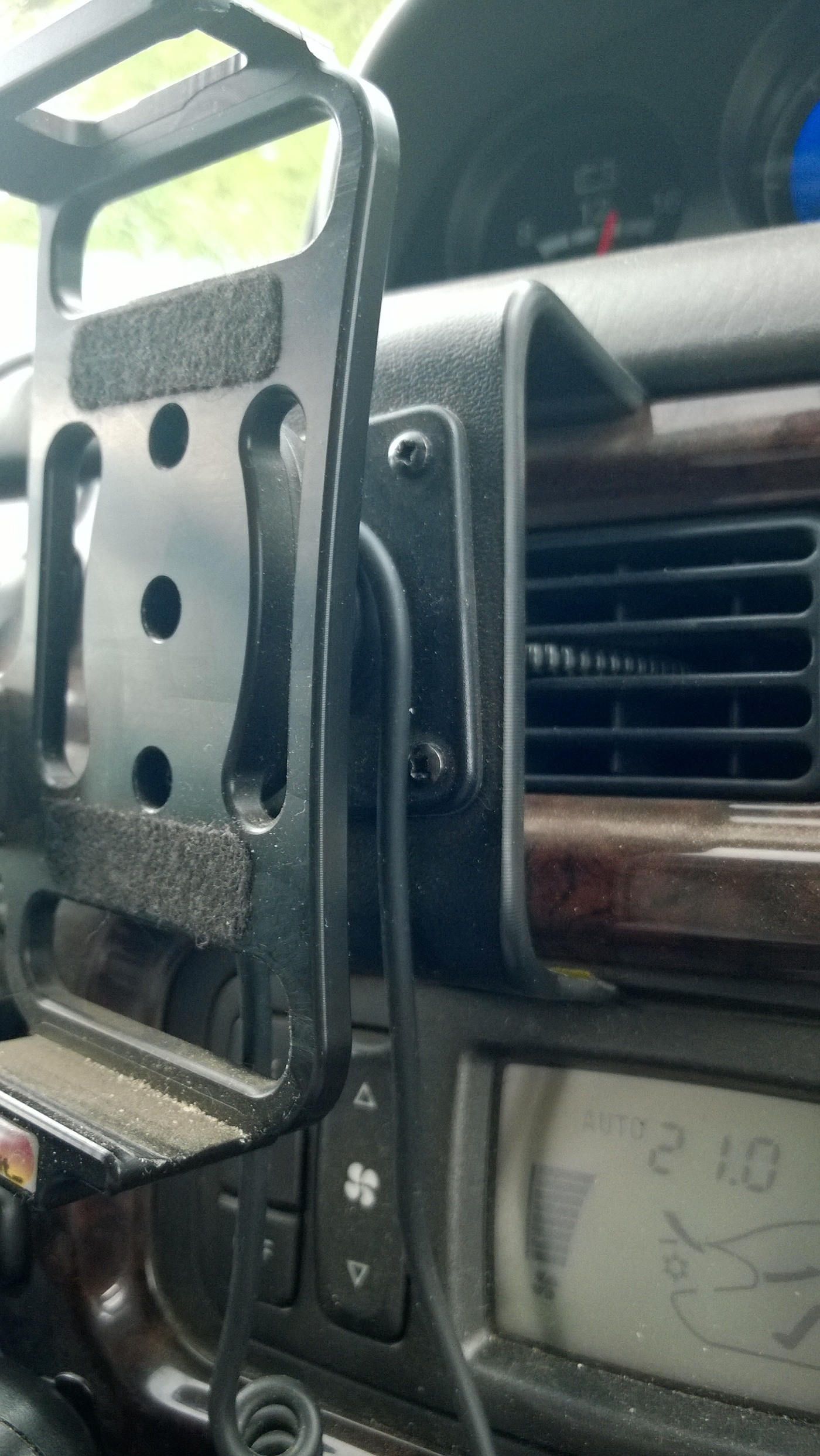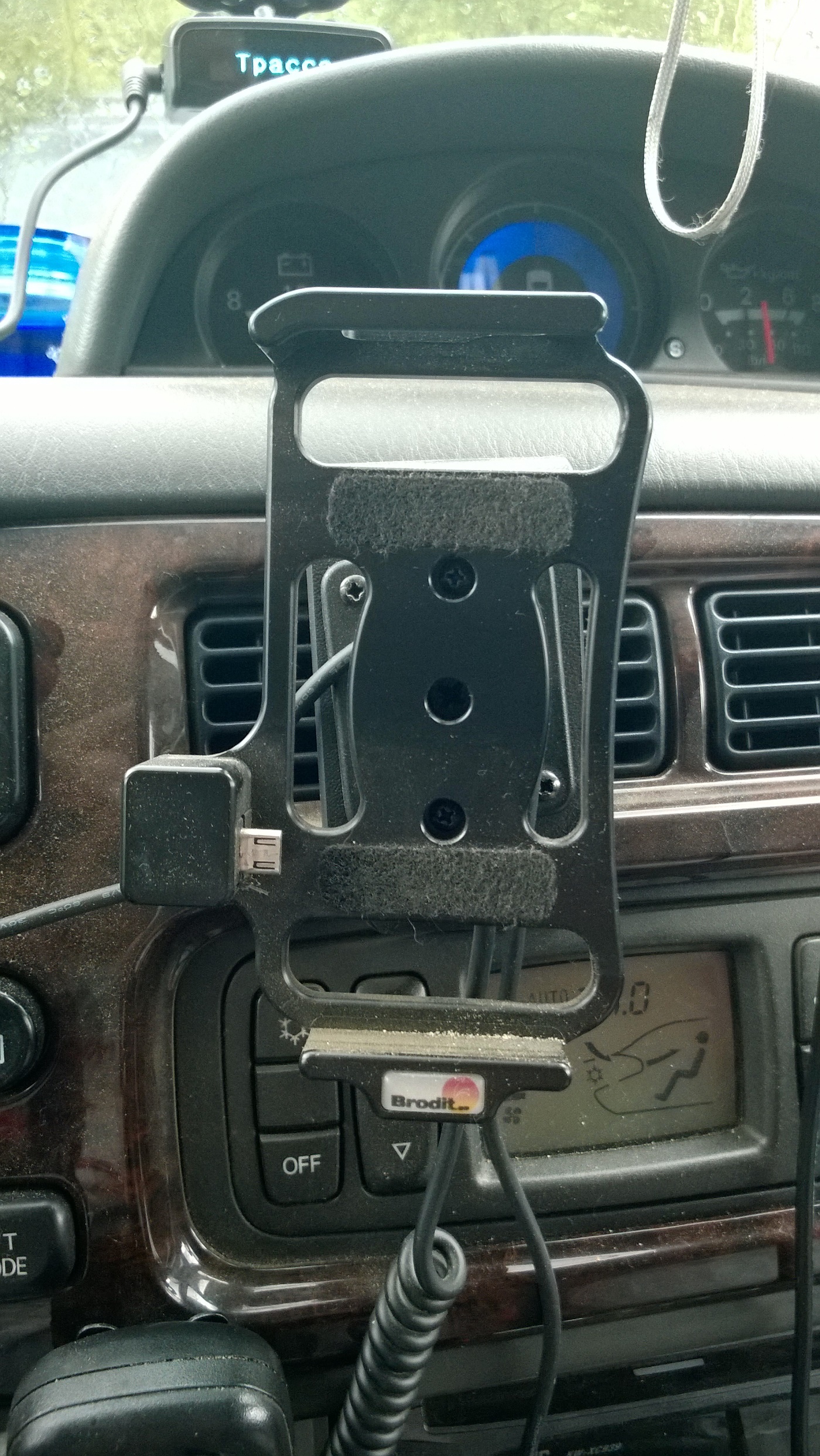 Держатель крепится кронштейном в спорт старый около средних дефлекторов салона.