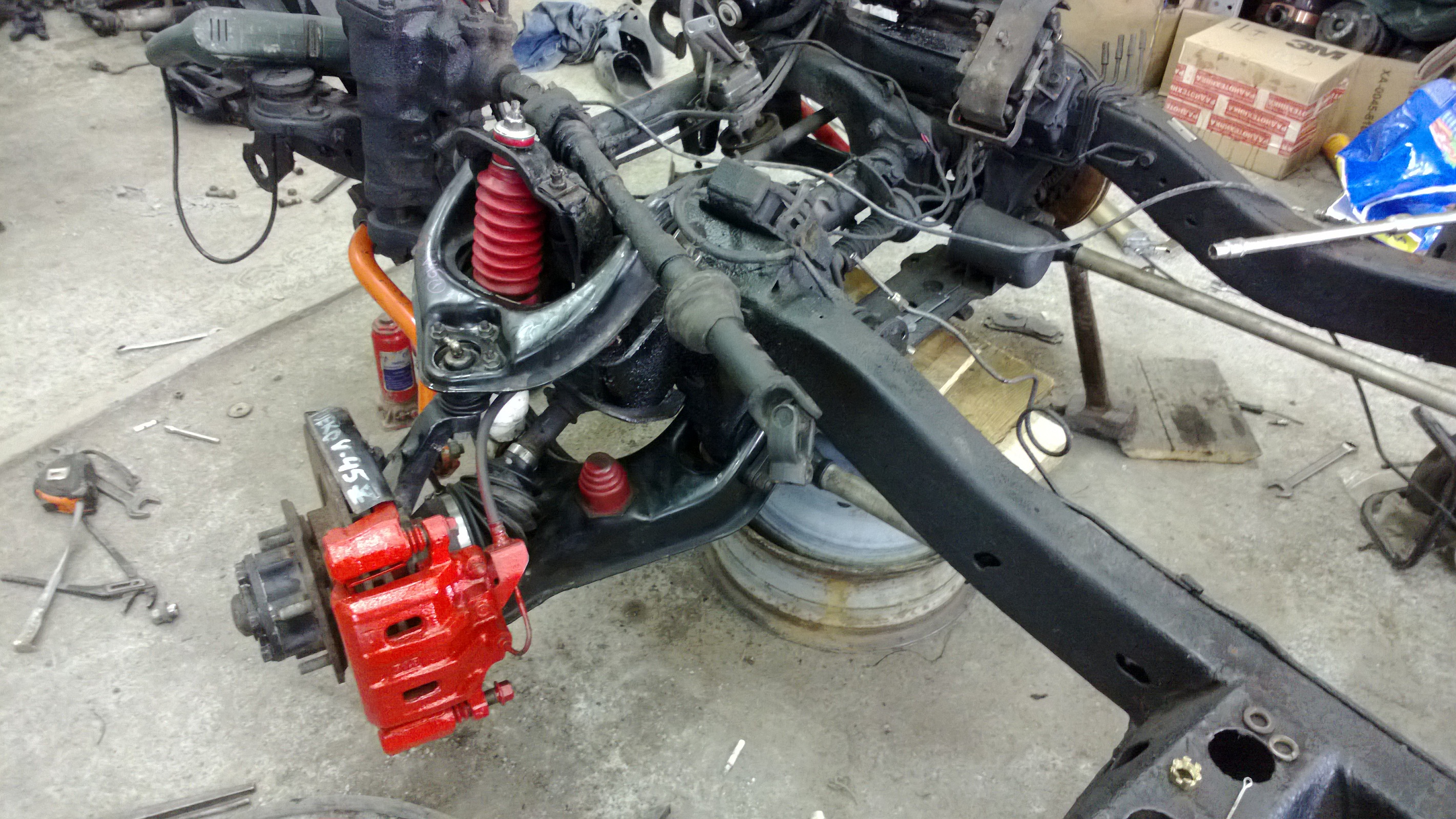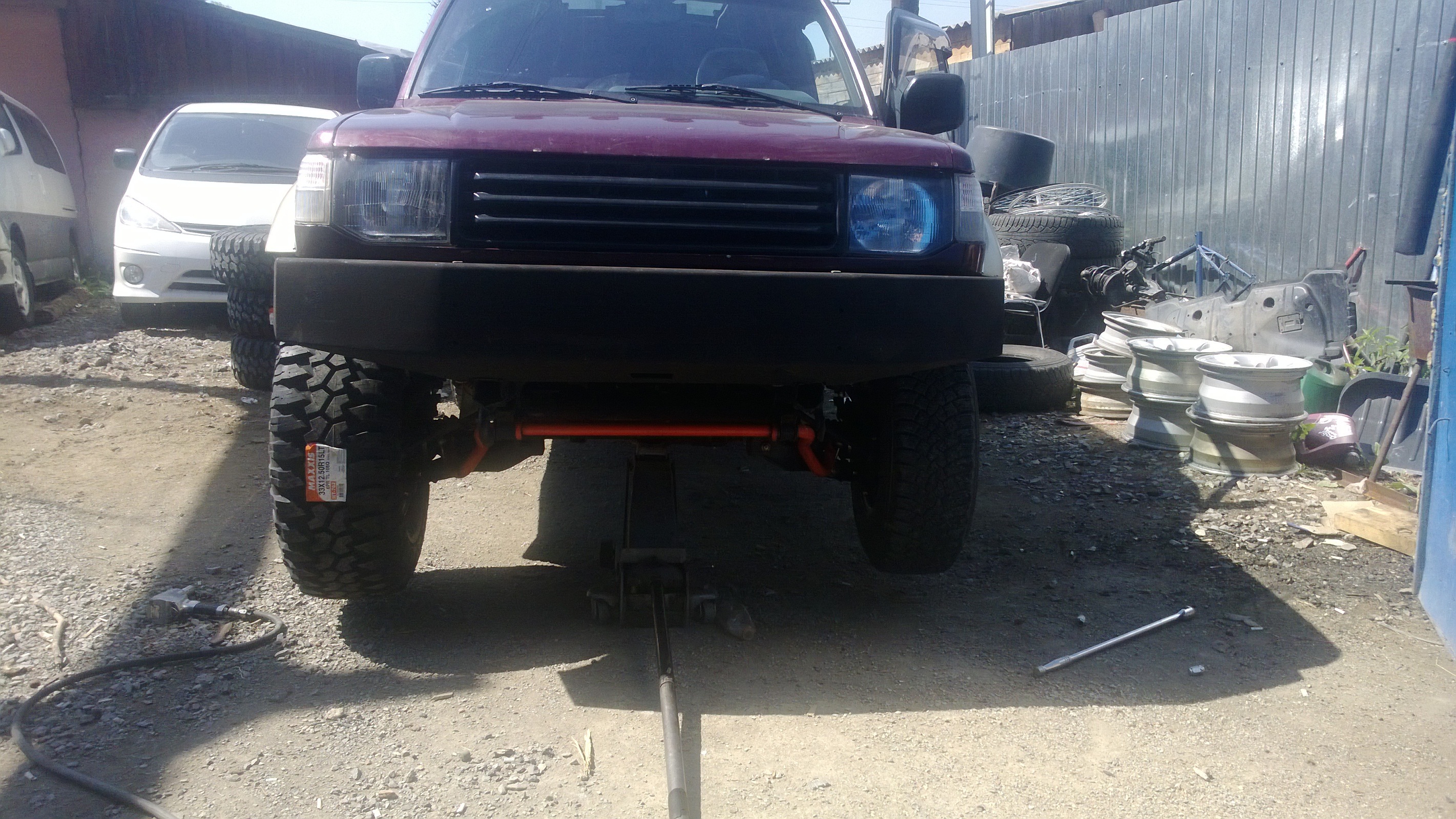 С Владивостока купил всю подвеску +3 дюйма, амортизаторы Rancho RS9000XL с регулировкой в 5 положениях, пружины +300 кг, торсионы, передние рычаги, передний и задний усиленные стабилизаторы, передние тормоза увеличенного радиуса, регулируемая тяга панара. Проставки между кузовом и рамой не ставил.