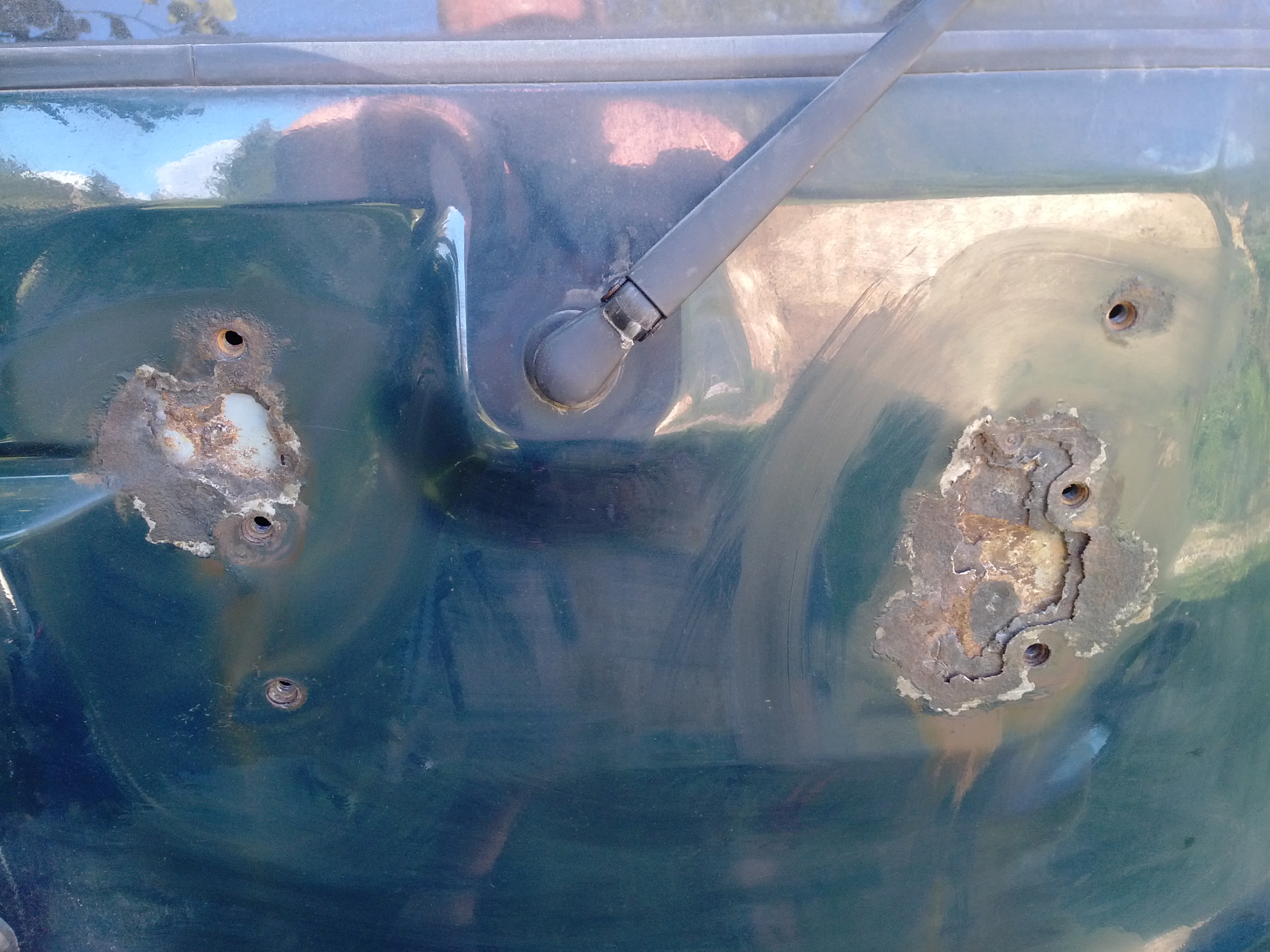 2. как отремонтировать заднюю дверь в местах крепления кронштейна запаски (варить или замена двери на БУ или еще т.п.). Само усиление внутри двери абсолютно целое. Дыры я расковырял сам, чтобы понять масштаб бедствия.